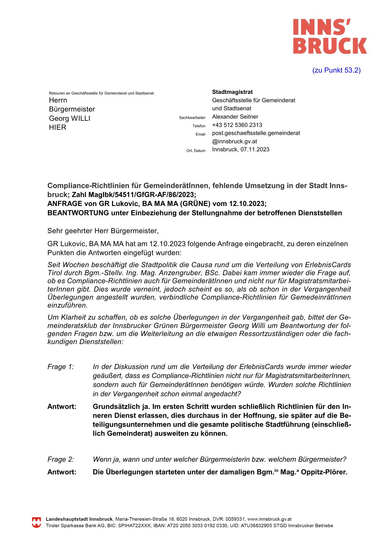 Compliance-Richtlinien für GemeinderätInnen, fehlende Umsetzung in der Stadt Innsbruck; Zahl MagIbk/54511/GfGR-AF/86/2023;