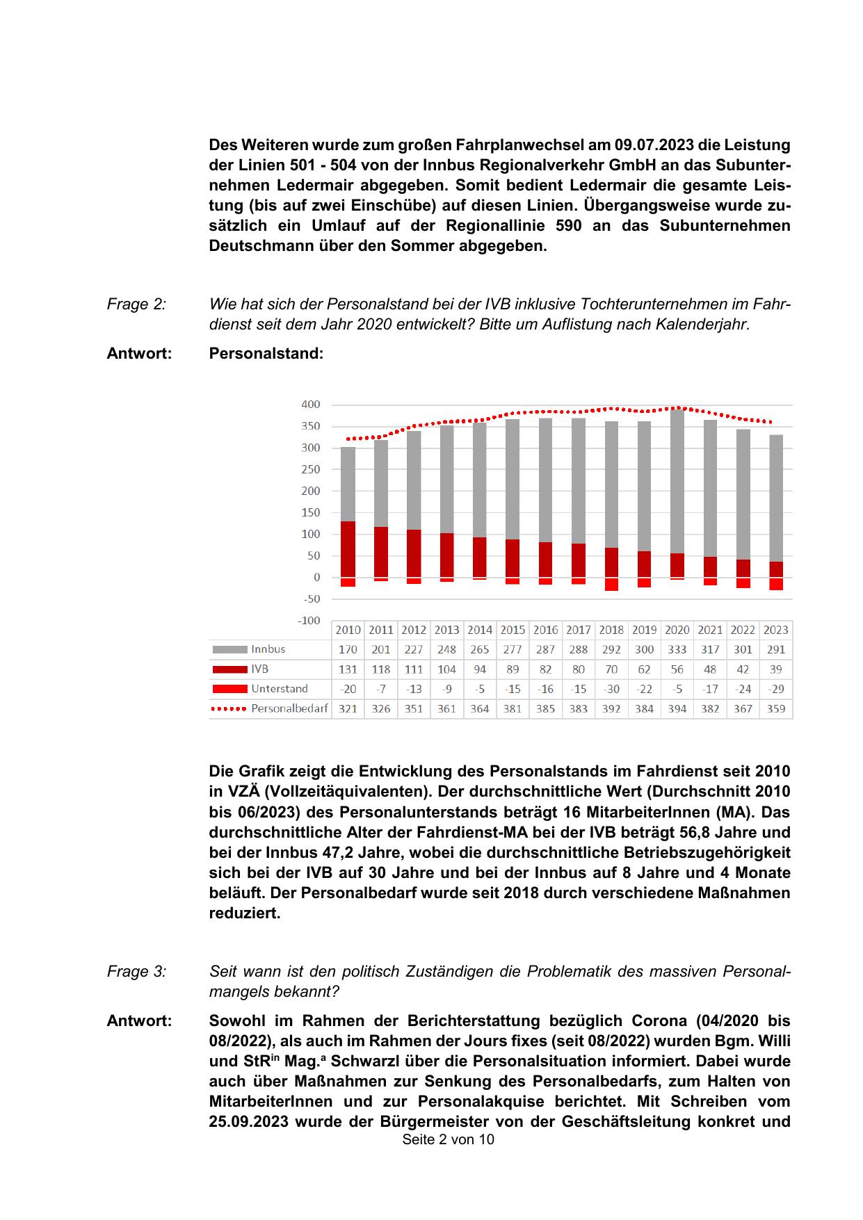 Wie hat sich der Personalstand bei der IVB inklusive Tochterunternehmen im Fahrdienst seit dem Jahr 2020 entwickelt? Bitte um Auflistung nach Kalenderjahr.