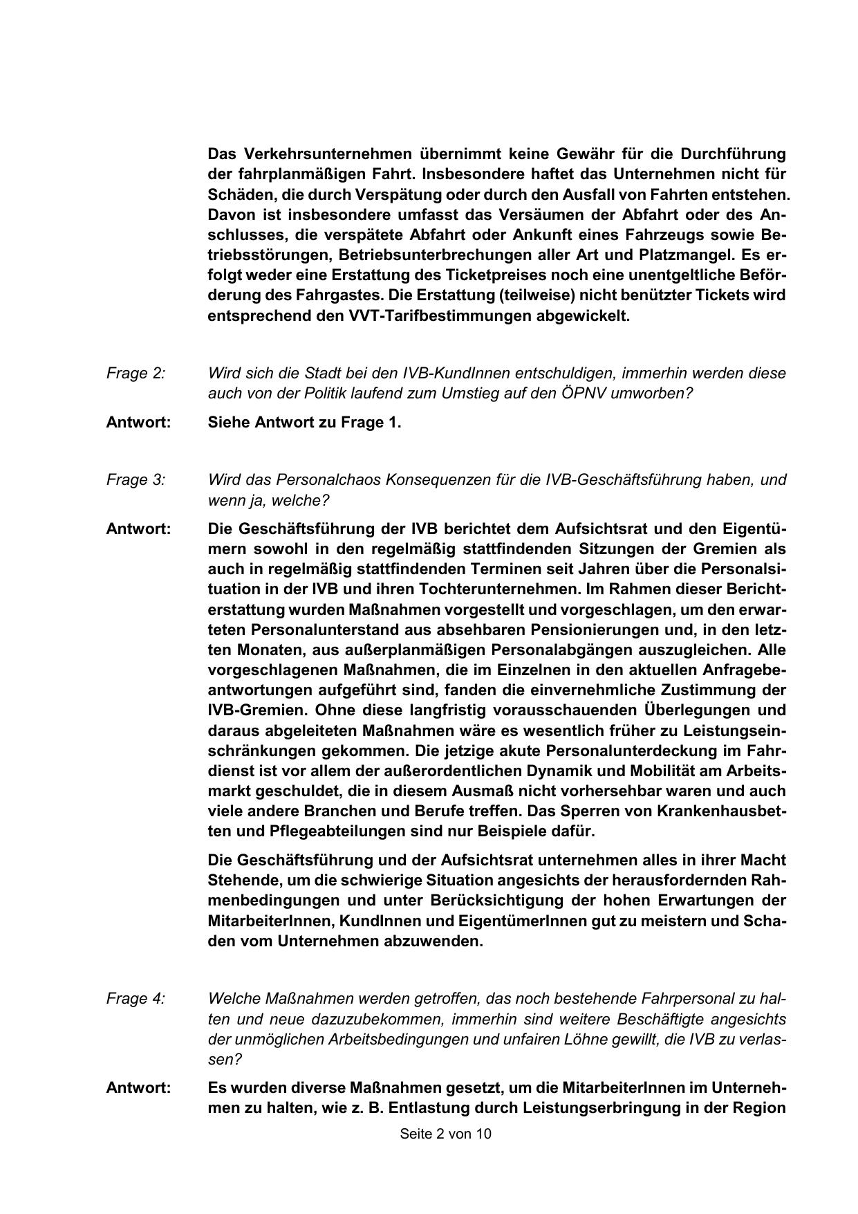 auch in regelmäßig stattfindenden Terminen seit Jahren über die Personalsituation in der IVB und ihren Tochterunternehmen. Im Rahmen dieser Berichterstattung wurden Maßnahmen vorgestellt und vorgeschlagen, um den erwarteten Personalunterstand aus absehbaren Pensionierungen und, in den letzten Monaten, aus außerplanmäßigen Personalabgängen auszugleichen. Alle