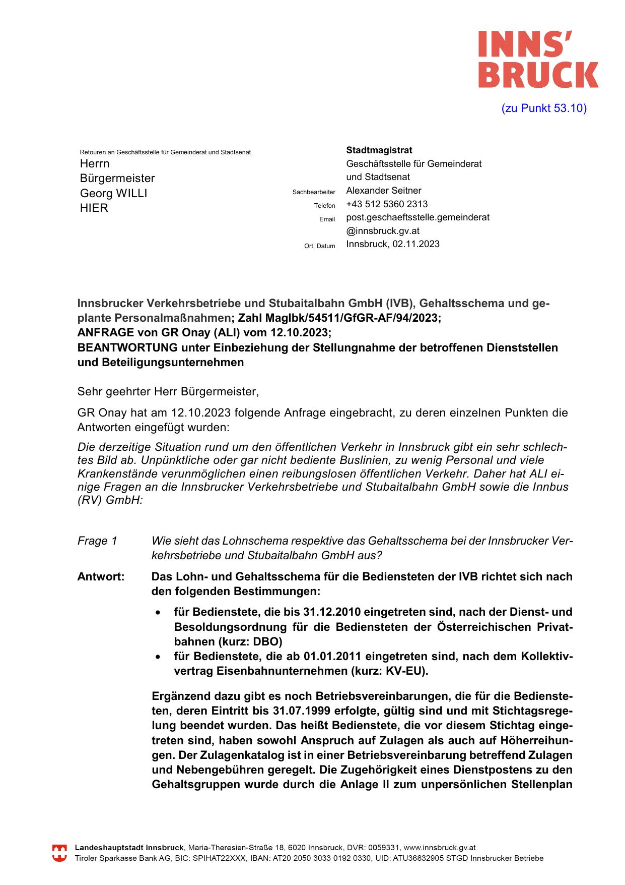 Innsbrucker Verkehrsbetriebe und Stubaitalbahn GmbH (IVB), Gehaltsschema und geplante Personalmaßnahmen; Zahl MagIbk/54511/GfGR-AF/94/2023;