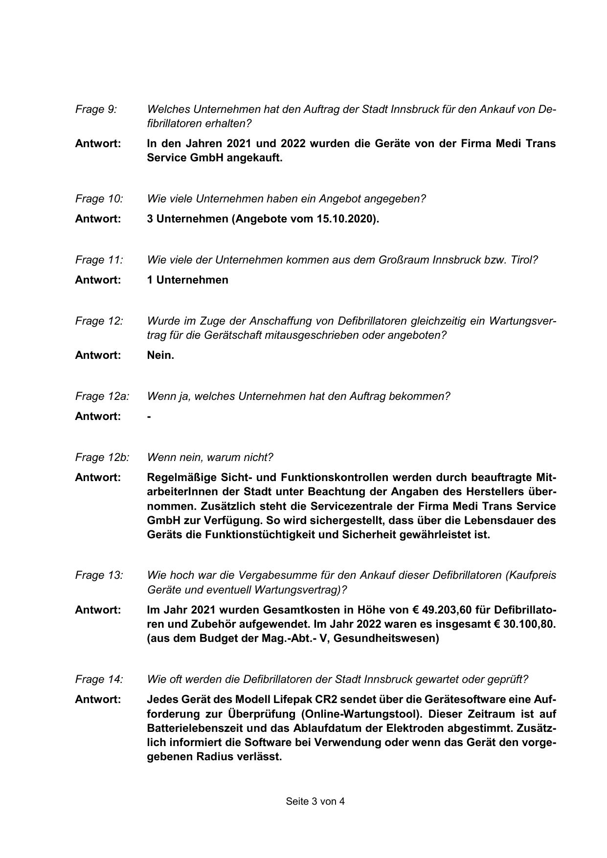 Wie oft werden die Defibrillatoren der Stadt Innsbruck gewartet oder geprüft?