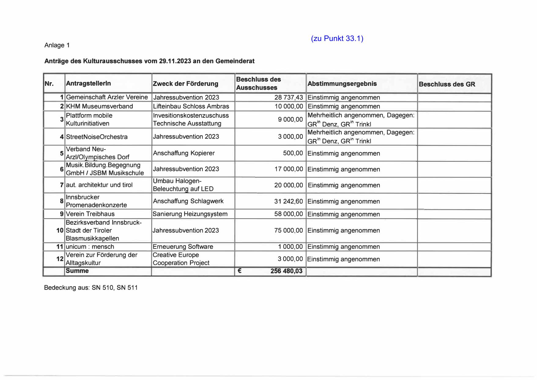 Anträge des Kulturausschusses vom 29.11.2023 an den Gemeinderat