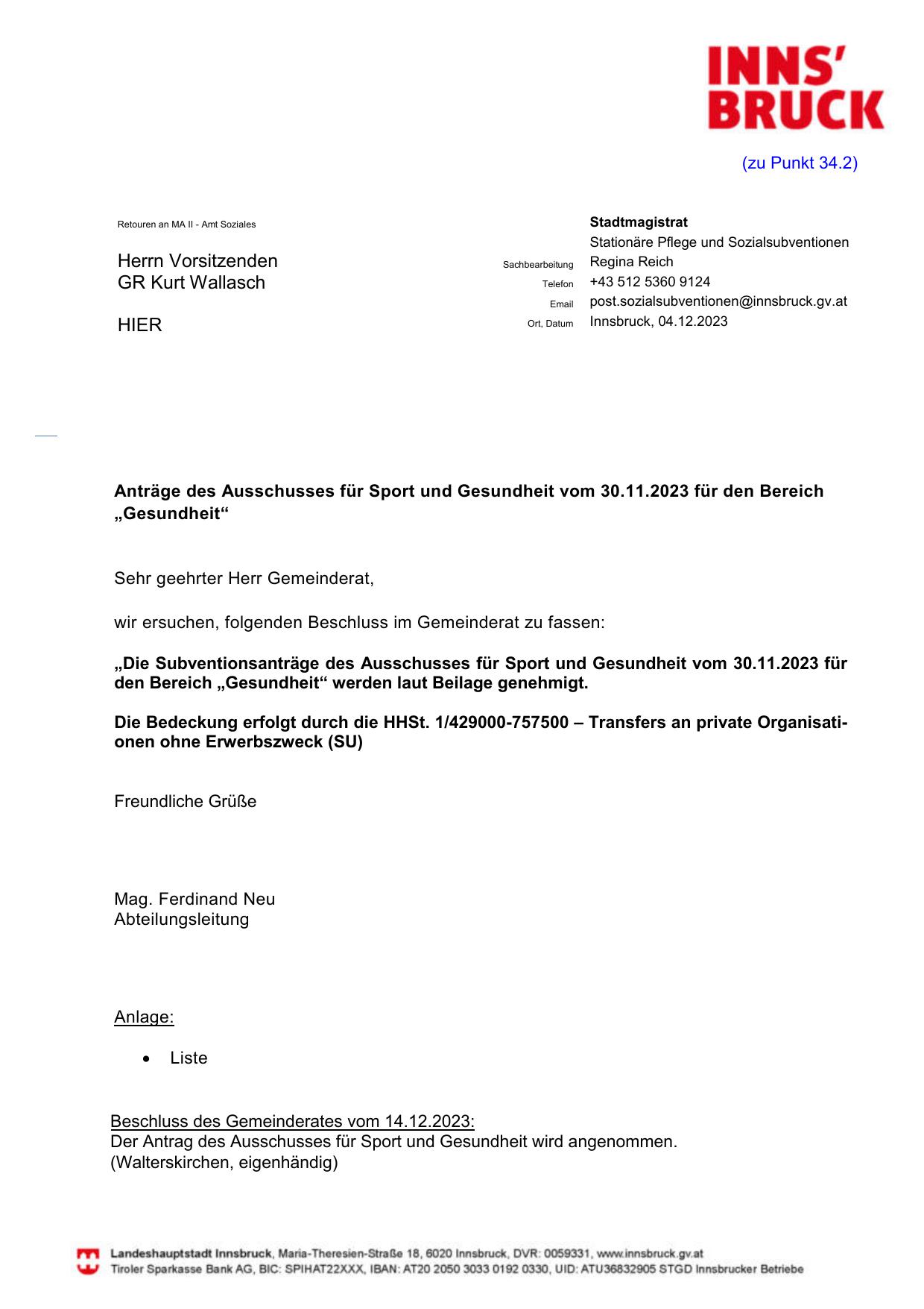 „Die Subventionsanträge des Ausschusses für Sport und Gesundheit vom 30.11.2023 für