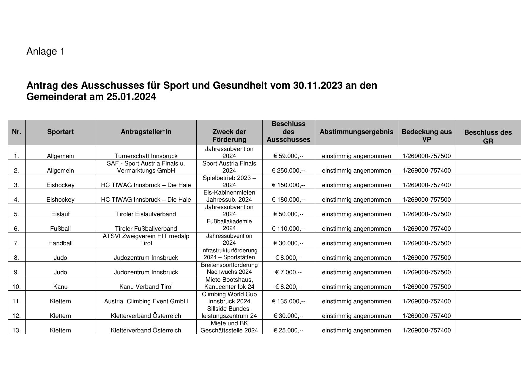 Antrag des Ausschusses für Sport und Gesundheit vom 30.11.2023 an den