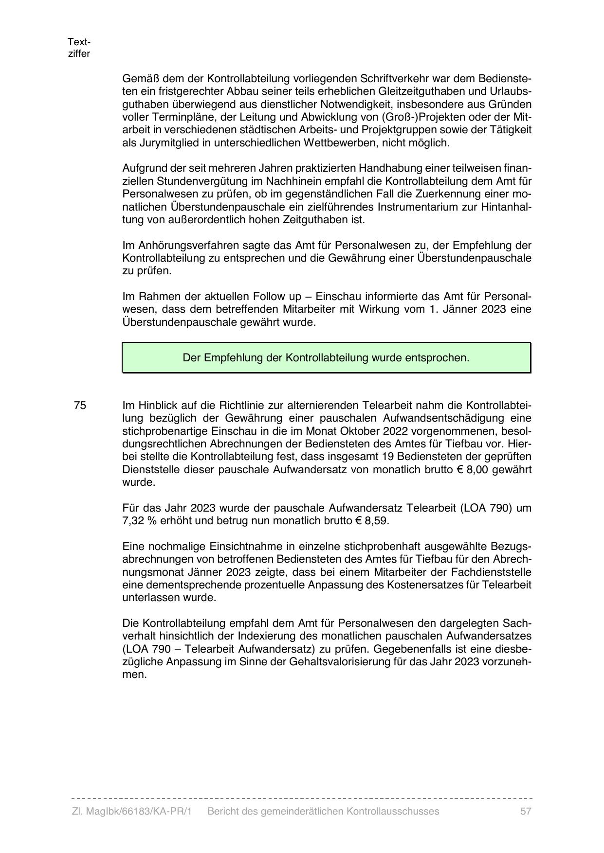 Eine nochmalige Einsichtnahme in einzelne stichprobenhaft ausgewählte Bezugsabrechnungen von betroffenen Bediensteten des Amtes für Tiefbau für den Abrechnungsmonat Jänner 2023 zeigte, dass bei einem Mitarbeiter der Fachdienststelle