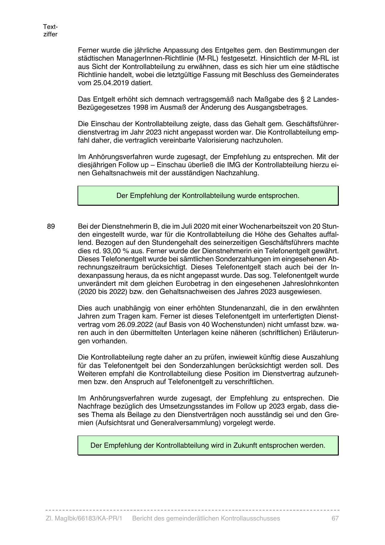 Die Einschau der Kontrollabteilung zeigte, dass das Gehalt gem. Geschäftsführerdienstvertrag im Jahr 2023 nicht angepasst worden war. Die Kontrollabteilung empfahl daher, die vertraglich vereinbarte Valorisierung nachzuholen.