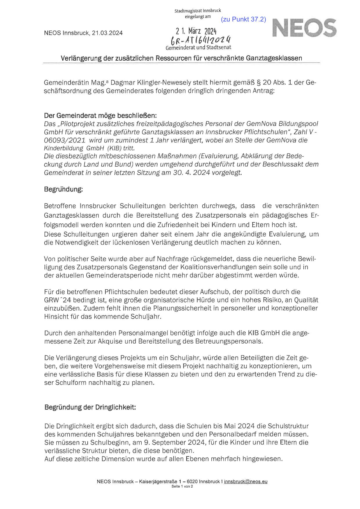 GmbH für verschränkt geführte Ganztagsklassen an lnnsbrucker Pflichtschulen", Zahl V 06093/2021 wird um zumindest 1 Jahr verlängert, wobei an Stelle der GemNova die