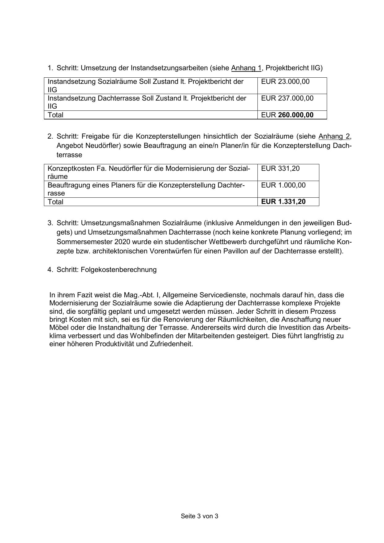 3. Schritt: Umsetzungsmaßnahmen Sozialräume (inklusive Anmeldungen in den jeweiligen Budgets) und Umsetzungsmaßnahmen Dachterrasse (noch keine konkrete Planung vorliegend; im