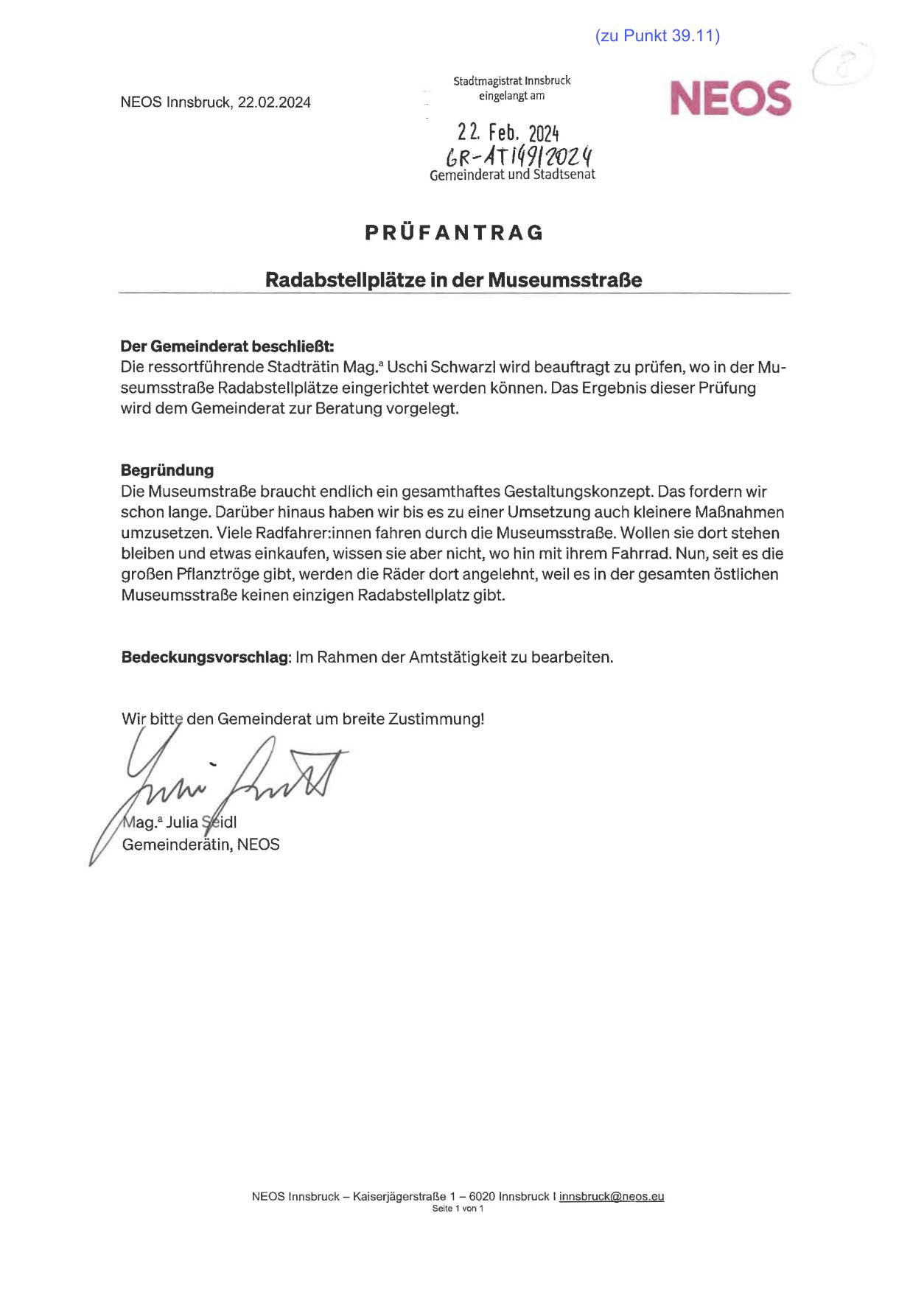 Die ressortführende Stadträtin Mag.a Uschi Schwarz! wird beauftragt zu prüfen, wo in der Museumsstraße Radabstellplätze eingerichtet werden können. Das Ergebnis dieser Prüfung