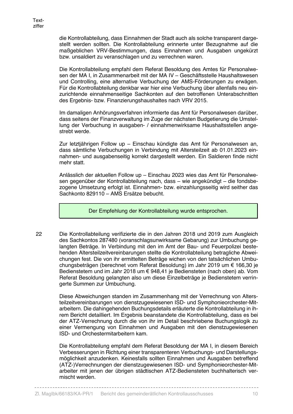 Anlässlich der aktuellen Follow up – Einschau 2023 wies das Amt für Personalwesen gegenüber der Kontrollabteilung nach, dass – wie angekündigt – die fondsbezogene Umsetzung erfolgt ist. Einnahmen- bzw. einzahlungsseitig wird seither das