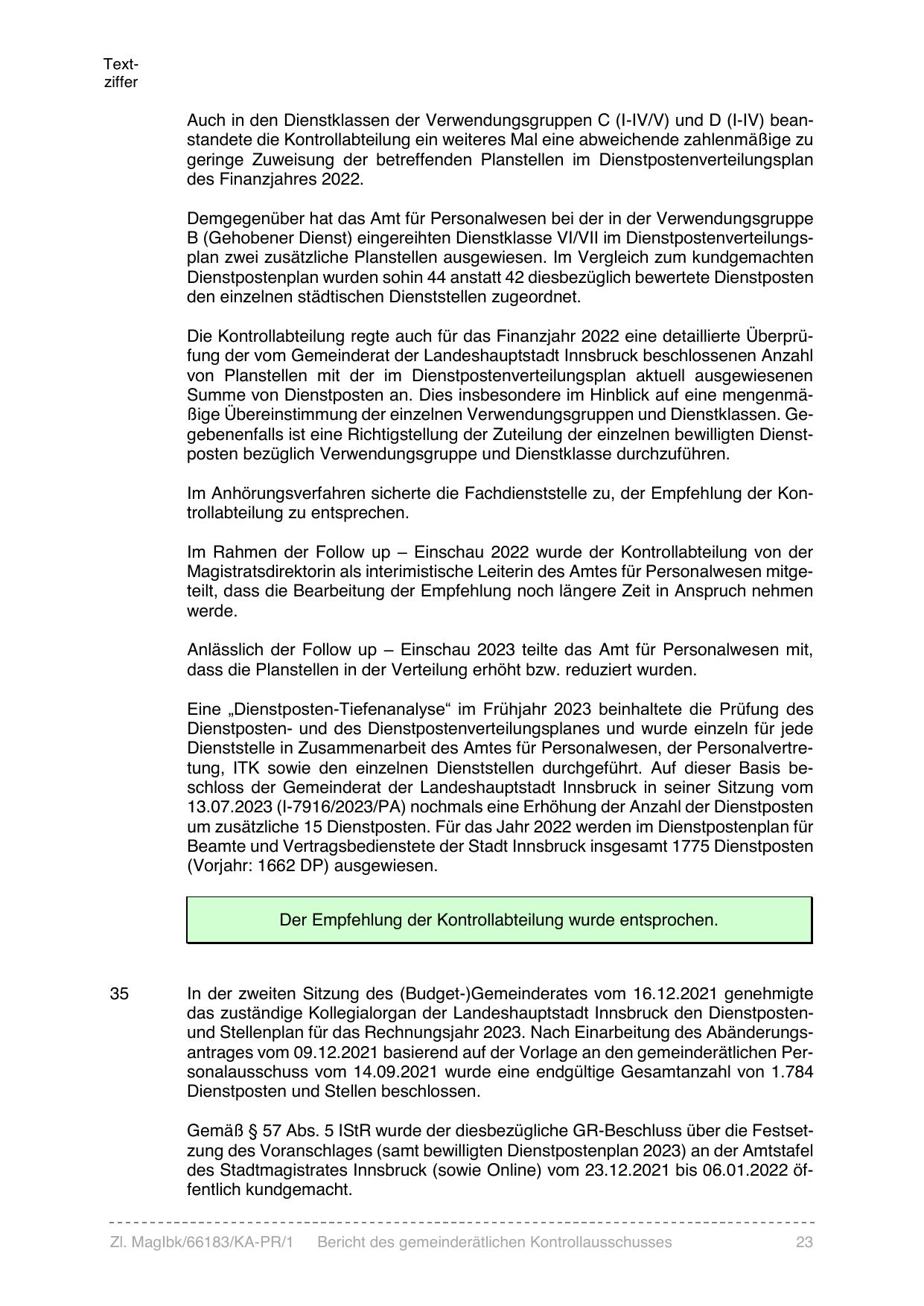 Die Kontrollabteilung regte auch für das Finanzjahr 2022 eine detaillierte Überprüfung der vom Gemeinderat der Landeshauptstadt Innsbruck beschlossenen Anzahl