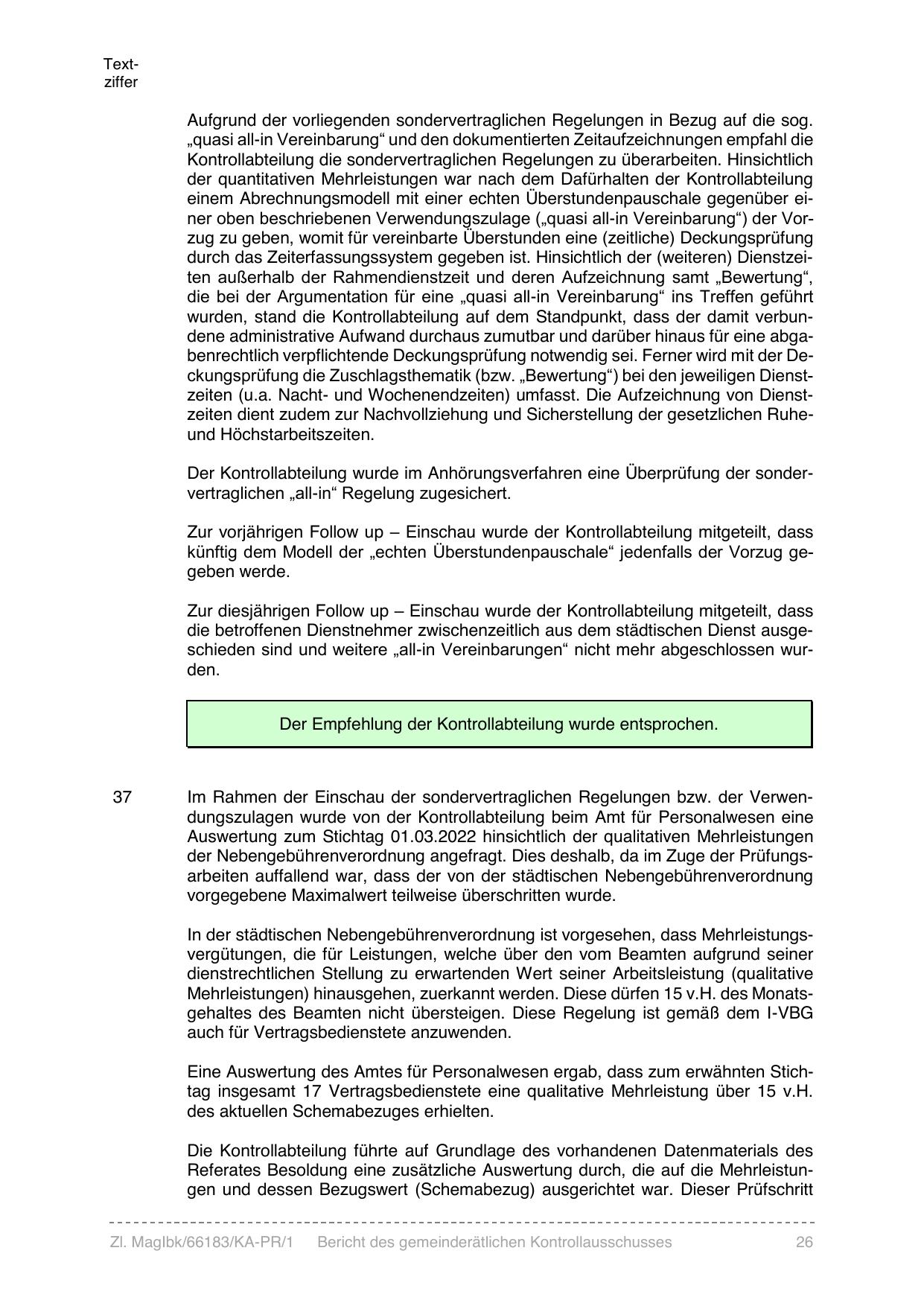 Der Kontrollabteilung wurde im Anhörungsverfahren eine Überprüfung der sondervertraglichen „all-in“ Regelung zugesichert.
