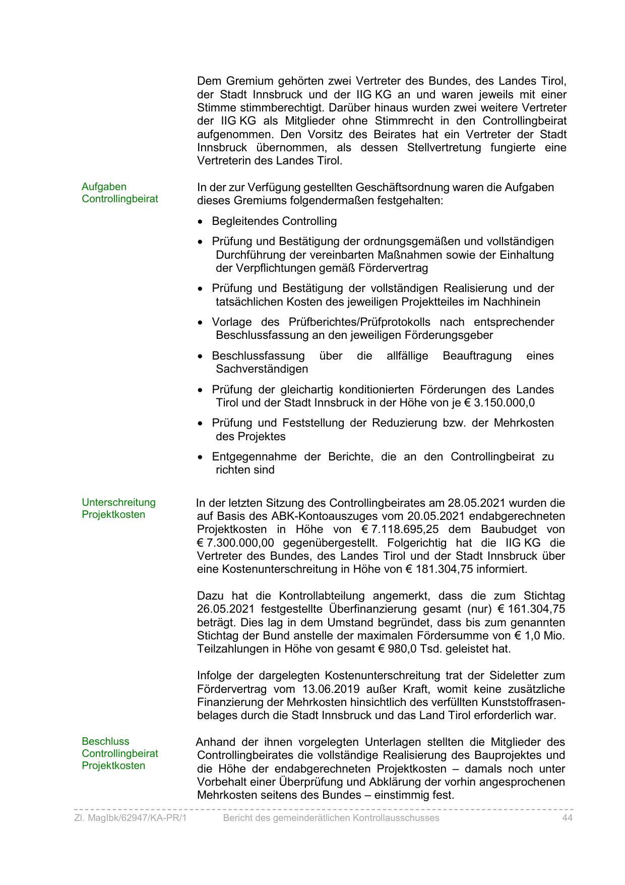 Finanzierung der Mehrkosten hinsichtlich des verfüllten Kunststoffrasenbelages durch die Stadt Innsbruck und das Land Tirol erforderlich war.