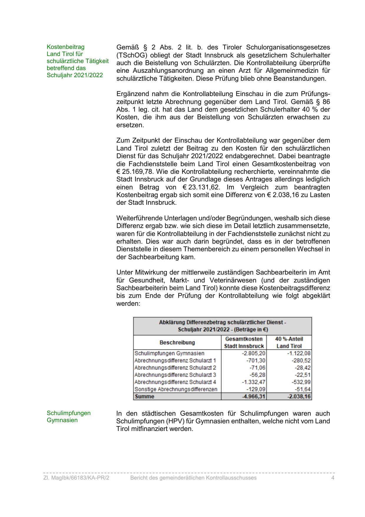 Land Tirol zuletzt der Beitrag zu den Kosten für den schulärztlichen