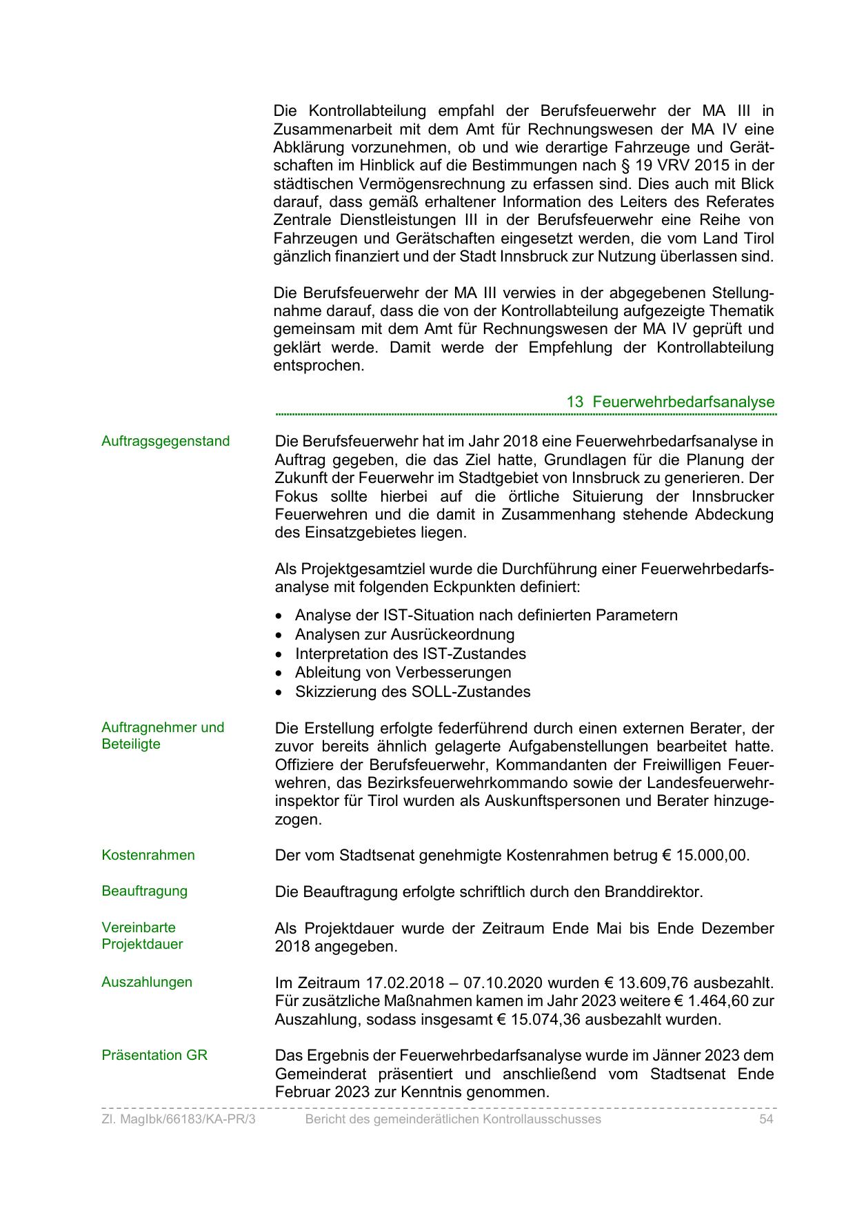 Die Kontrollabteilung empfahl der Berufsfeuerwehr der MA III in