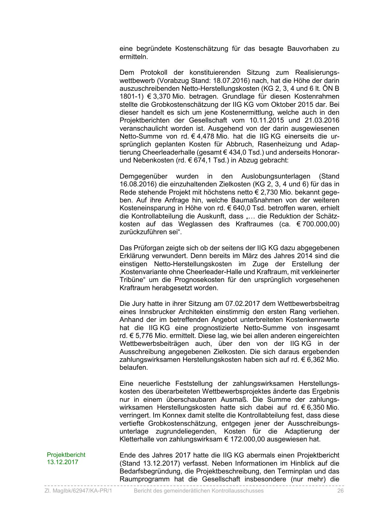 die Kontrollabteilung die Auskunft, dass „… die Reduktion der Schätzkosten auf das Weglassen des Kraftraumes (ca. € 700.000,00)