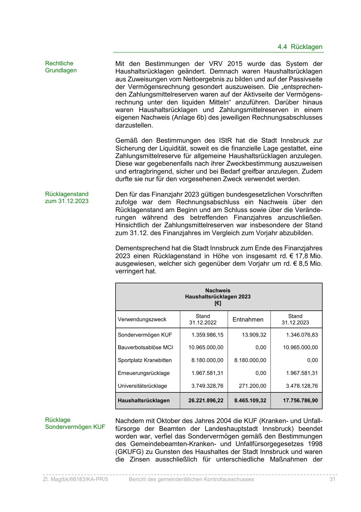 Rücklagenstand am Beginn und am Schluss sowie über die Veränderungen während des betreffenden Finanzjahres anzuschließen.