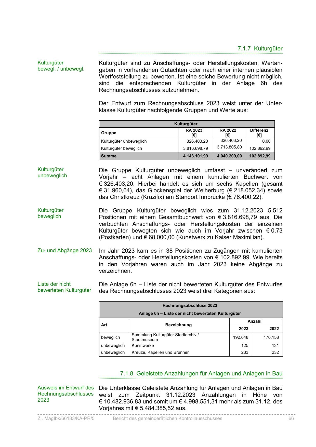 Der Entwurf zum Rechnungsabschluss 2023 weist unter der Unterklasse Kulturgüter nachfolgende Gruppen und Werte aus: