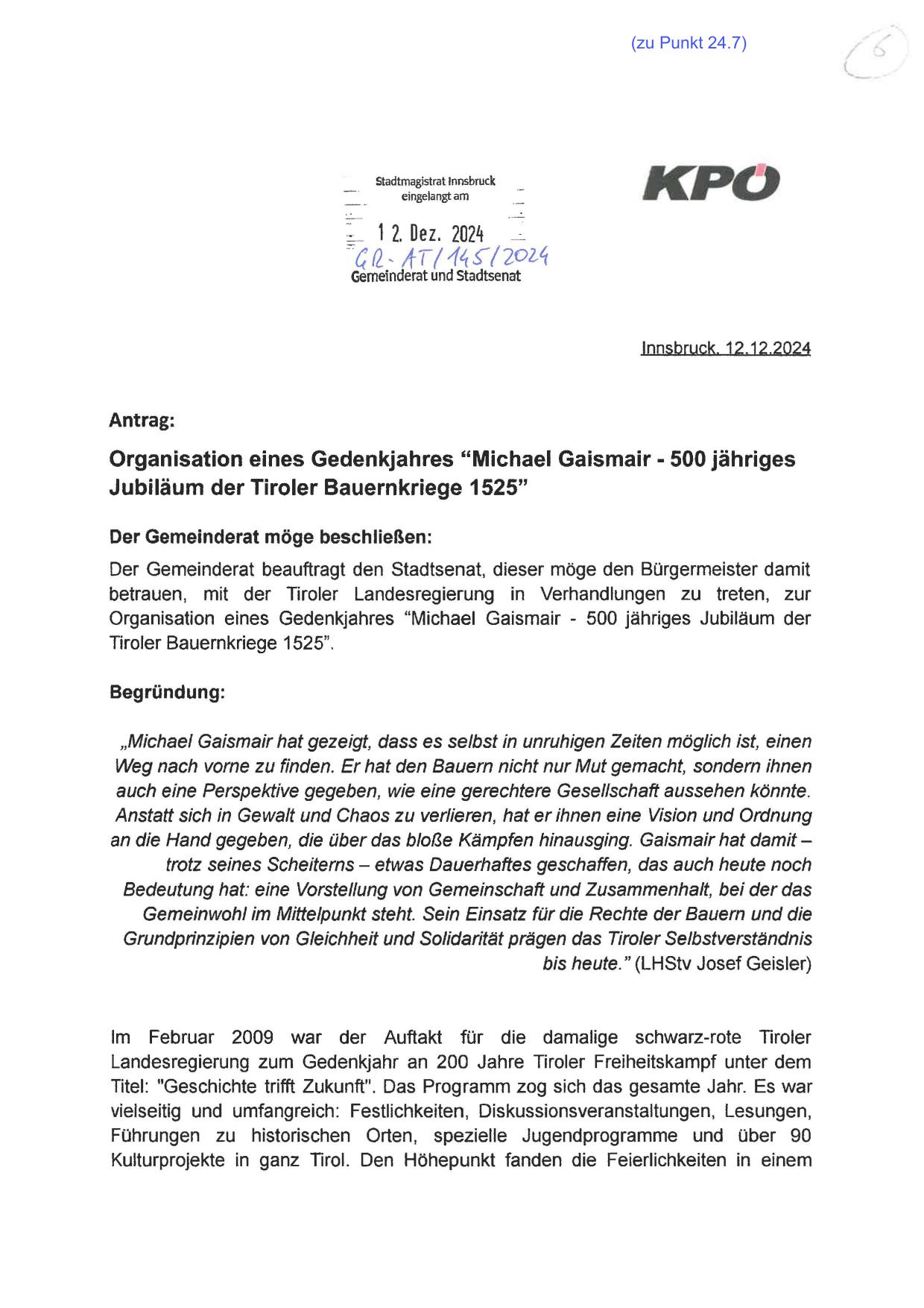 Organisation eines Gedenkjahres "Michael Gaismair - 500 jähriges Jubiläum der