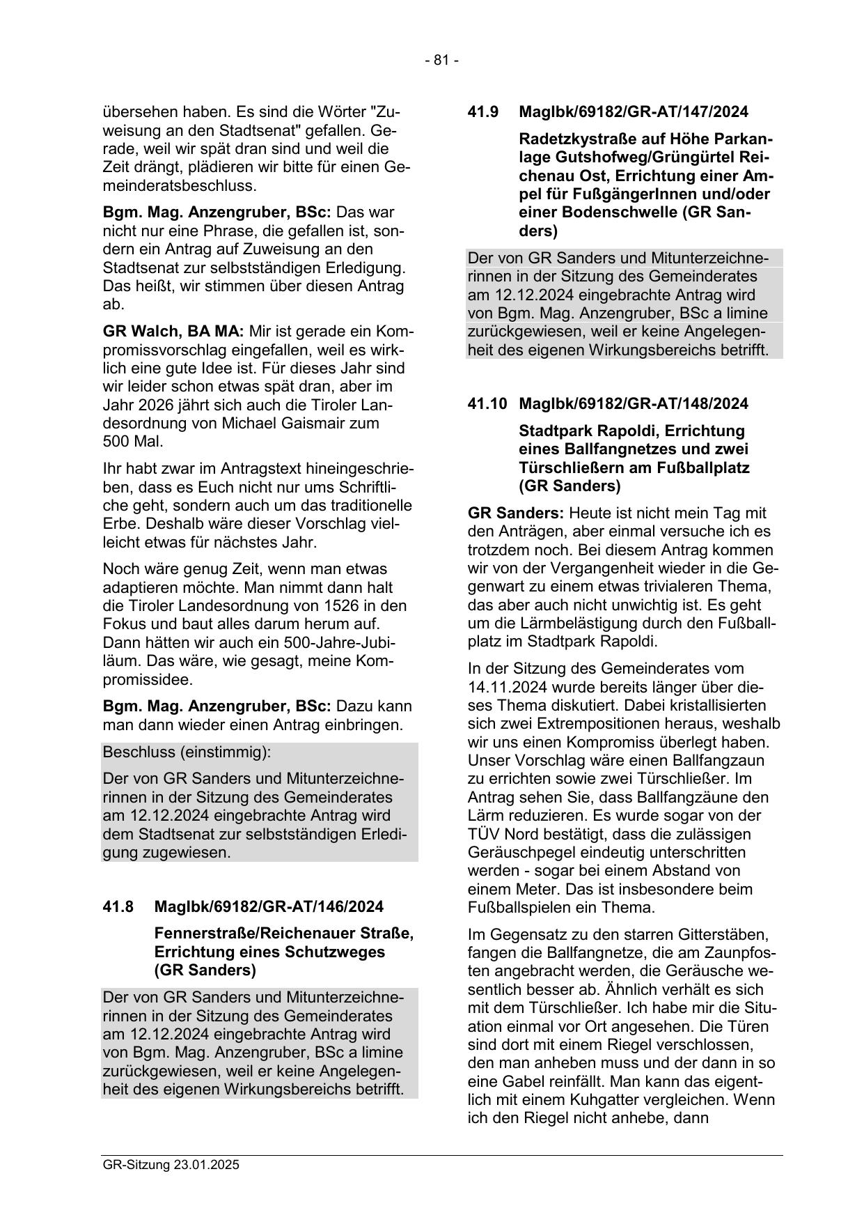 Der von GR Sanders und Mitunterzeichnerinnen in der Sitzung des Gemeinderates