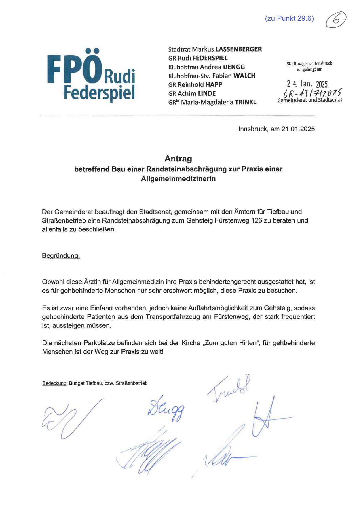 Straßenbetrieb eine Randsteinabschrägung zum Gehsteig Fürstenweg 126 zu beraten und
