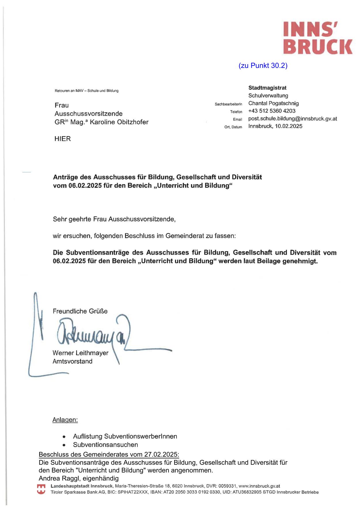 06.02.2025 für den Bereich „Unterricht und Bildung“ werden laut Beilage genehmigt.