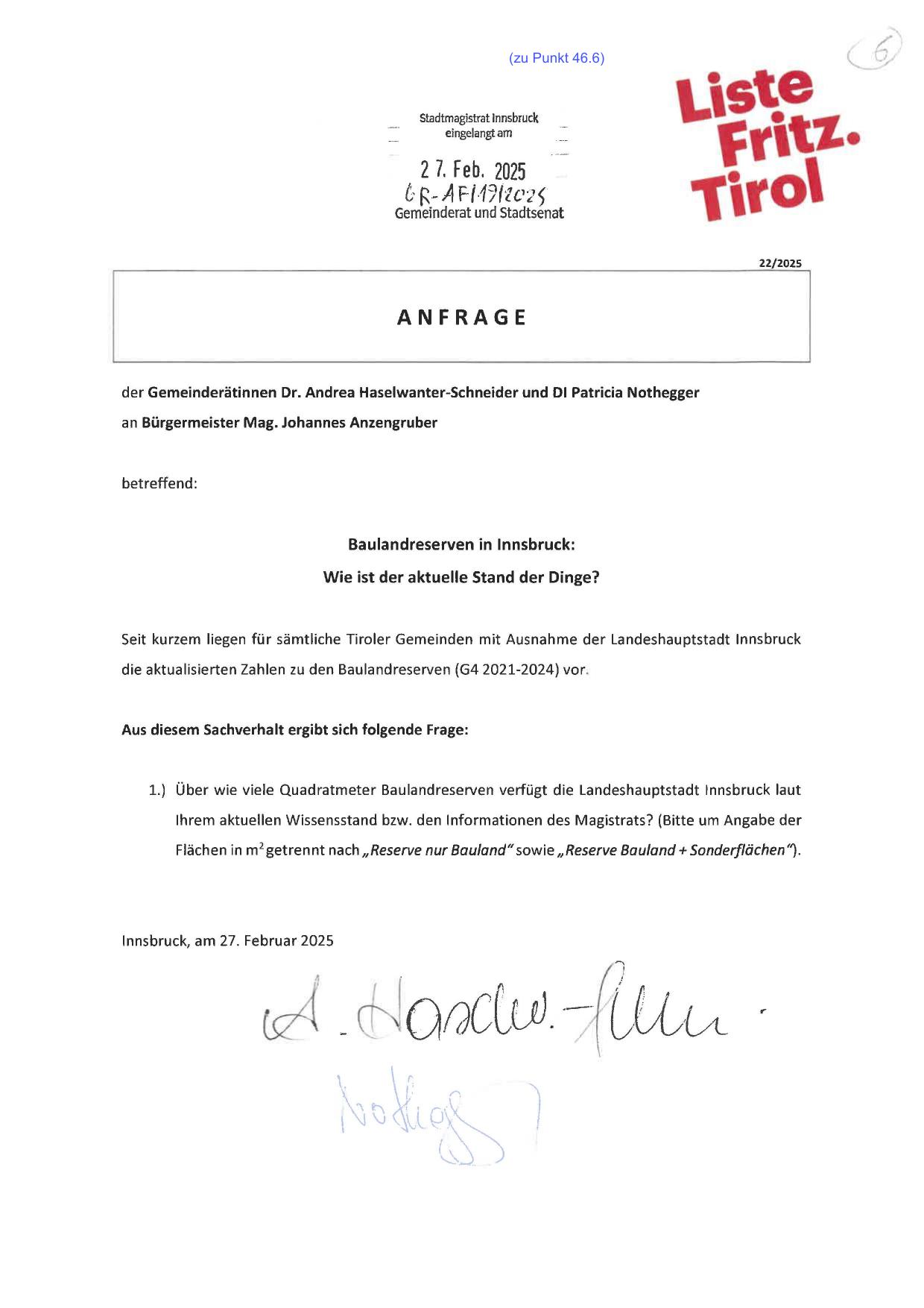1.) Über wie viele Quadratmeter Baulandreserven verfügt die Landeshauptstadt Innsbruck laut