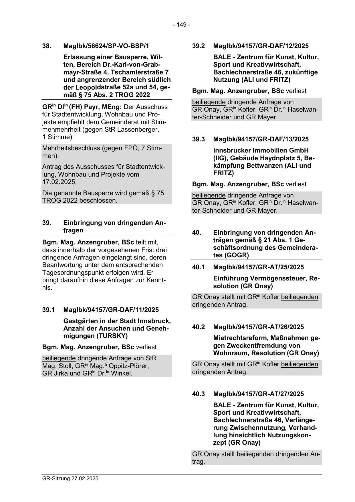 Mehrheitsbeschluss (gegen FPÖ, 7 Stimmen):