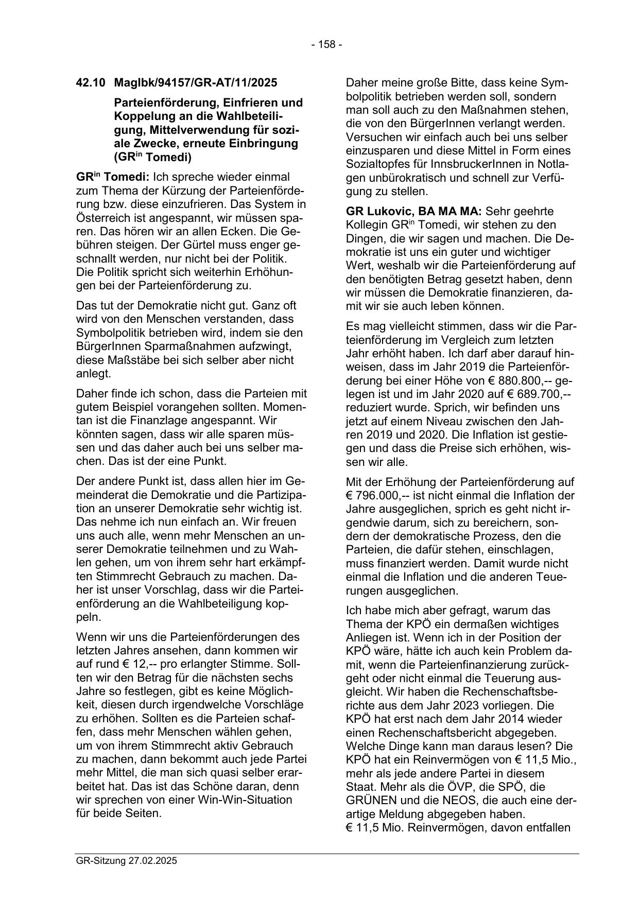 Jahr erhöht haben. Ich darf aber darauf hinweisen, dass im Jahr 2019 die Parteienförderung bei einer Höhe von € 880.800,-- gelegen ist und im Jahr 2020 auf € 689.700,-reduziert wurde. Sprich, wir befinden uns