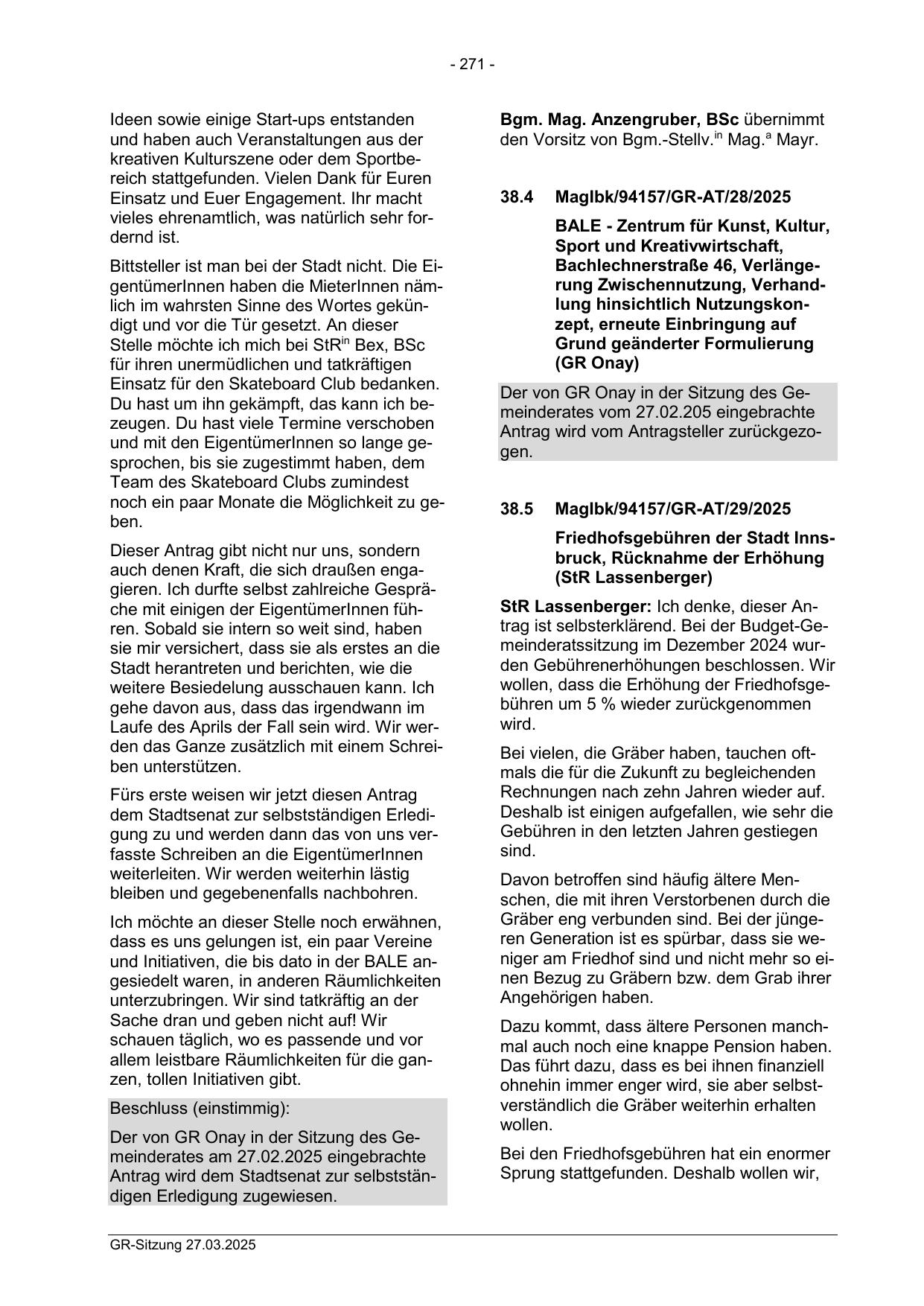 StR Lassenberger: Ich denke, dieser Antrag ist selbsterklärend. Bei der Budget-Gemeinderatssitzung im Dezember 2024 wurden Gebührenerhöhungen beschlossen. Wir