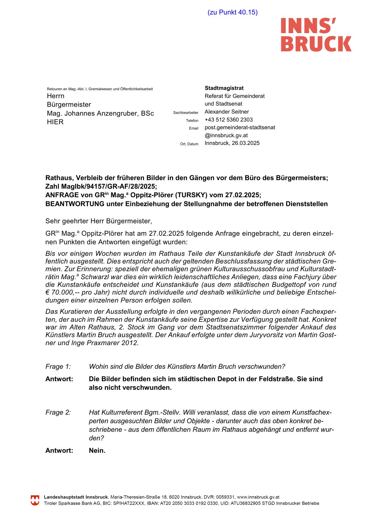 Bis vor einigen Wochen wurden im Rathaus Teile der Kunstankäufe der Stadt Innsbruck öffentlich ausgestellt. Dies entspricht auch der geltenden Beschlussfassung der städtischen Gremien. Zur Erinnerung: speziell der ehemaligen grünen Kulturausschussobfrau und Kulturstadträtin Mag.a Schwarzl war dies ein wirklich leidenschaftliches Anliegen, dass eine Fachjury über