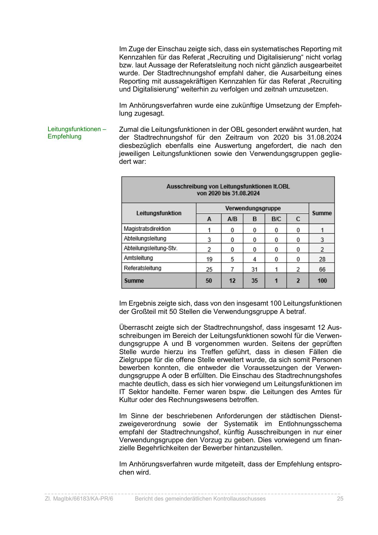 Überrascht zeigte sich der Stadtrechnungshof, dass insgesamt 12 Ausschreibungen im Bereich der Leitungsfunktionen sowohl für die Verwendungsgruppe A und B vorgenommen wurden. Seitens der geprüften