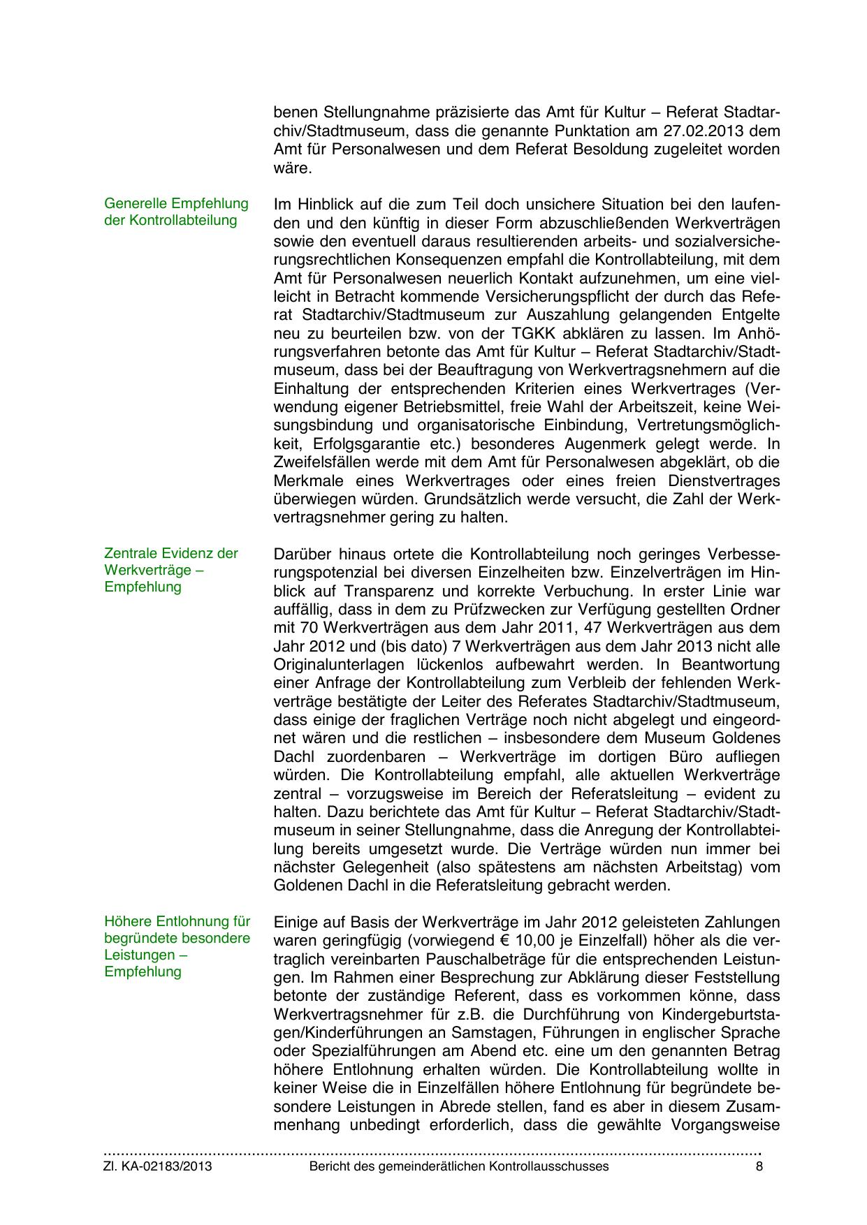neu zu beurteilen bzw. von der TGKK abklären zu lassen. Im Anhörungsverfahren betonte das Amt für Kultur – Referat Stadtarchiv/Stadtmuseum, dass bei der Beauftragung von Werkvertragsnehmern auf die