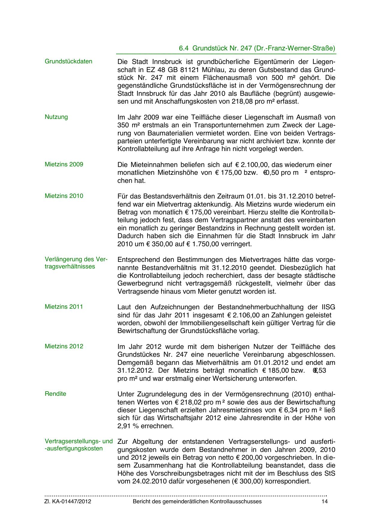 Unter Zugrundelegung des in der Vermögensrechnung (2010) enthaltenen Wertes von € 218,02 pro m ² sowie des aus der Bewirtschaftung