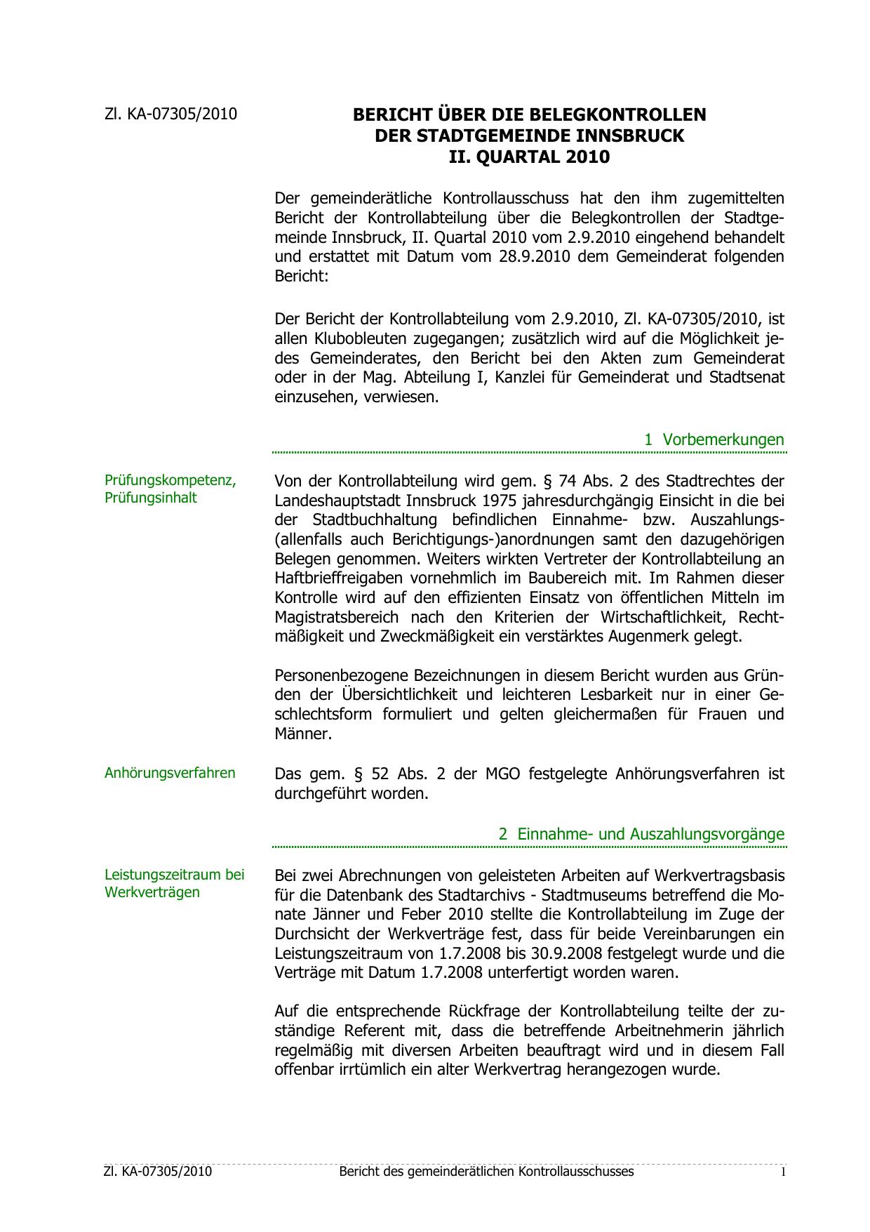 Bericht der Kontrollabteilung über die Belegkontrollen der Stadtgemeinde Innsbruck, II. Quartal 2010 vom 2.9.2010 eingehend behandelt