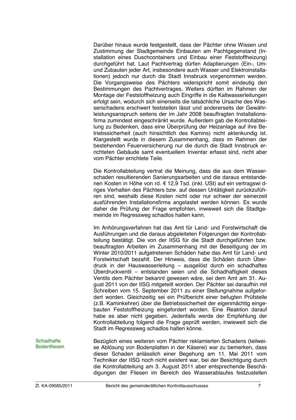 Die Kontrollabteilung vertrat die Meinung, dass die aus dem Wasserschaden resultierenden Sanierungsarbeiten und die daraus entstandenen Kosten in Höhe von rd. € 12,9 Tsd. (inkl. USt) auf ein vertragswi driges Verhalten des Pächters bzw. auf dessen Untätigkeit zurückzuführen sind, weshalb diese Kosten nicht oder nur schwer der seinerzeit