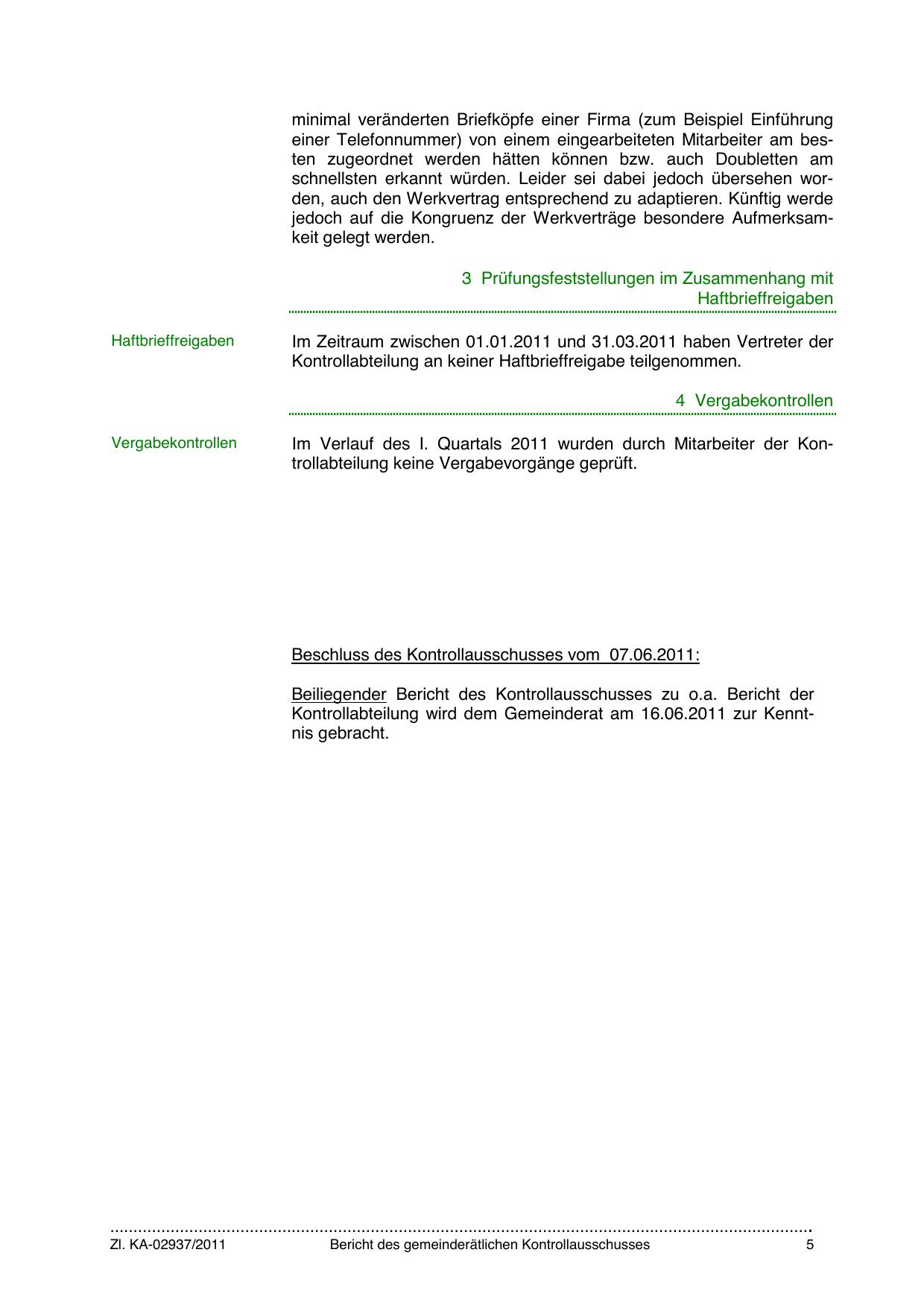 Beschluss des Kontrollausschusses vom 07.06.2011: