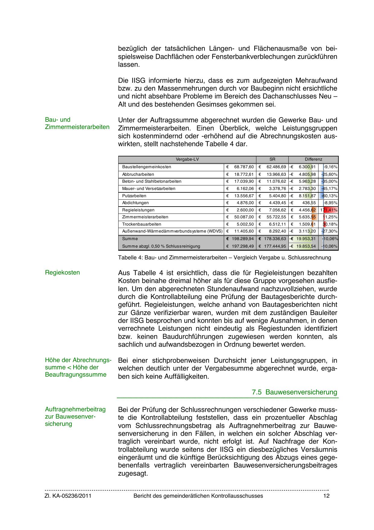 Tabelle 4: Bau- und Zimmermeisterarbeiten – Vergleich Vergabe u. Schlussrechnung