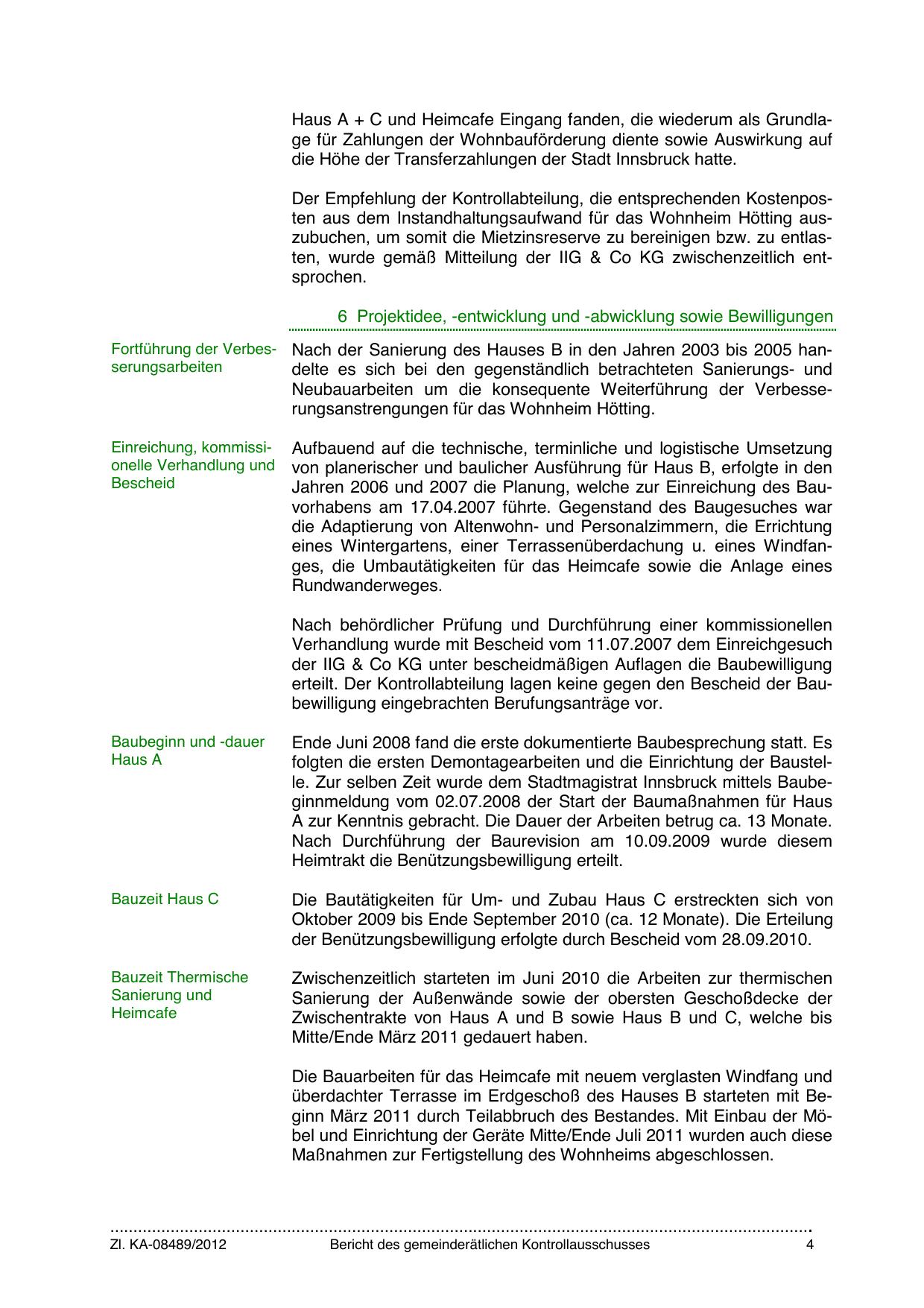 Haus A + C und Heimcafe Eingang fanden, die wiederum als Grundlage für Zahlungen der Wohnbauförderung diente sowie Auswirkung auf