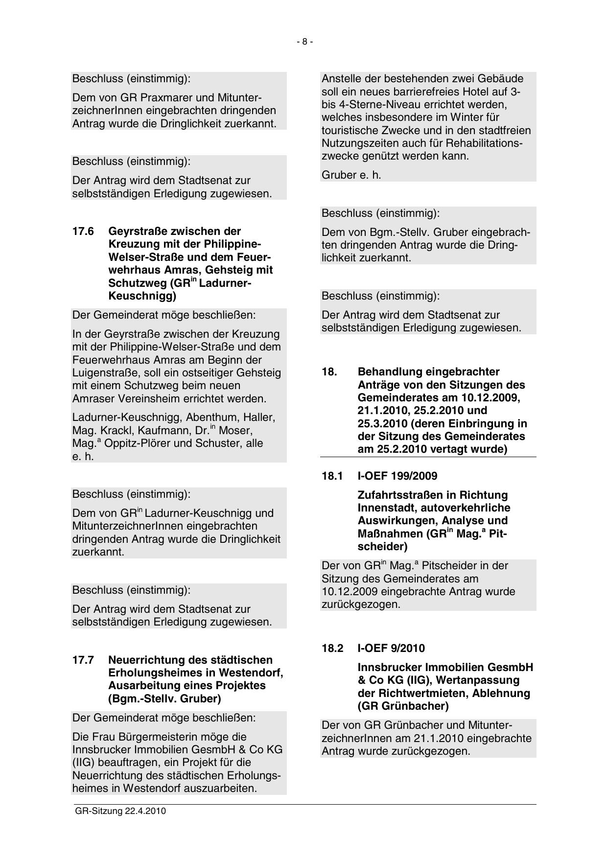 Der von GR Grünbacher und MitunterzeichnerInnen am 21.1.2010 eingebrachte