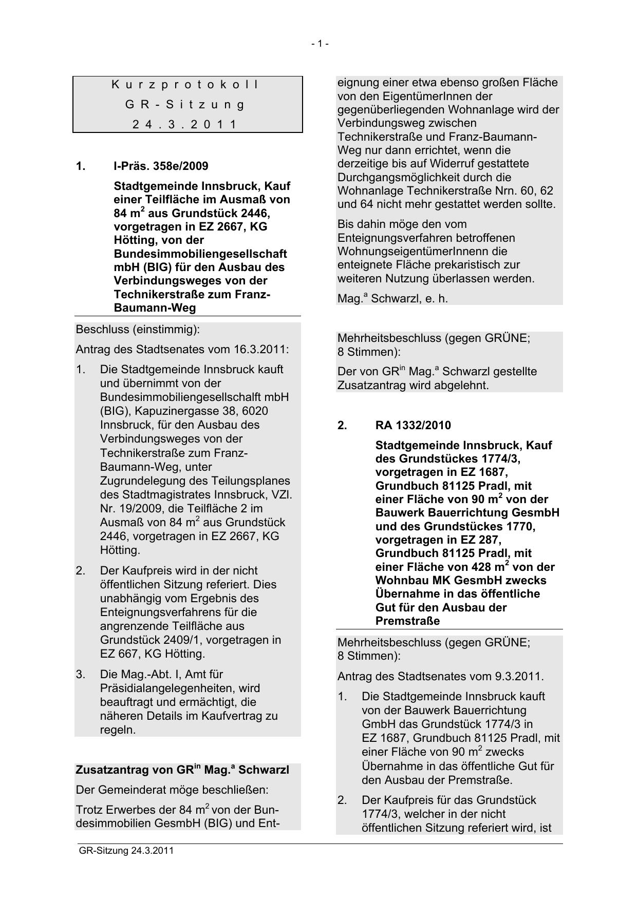 Trotz Erwerbes der 84 m2 von der Bundesimmobilien GesmbH (BIG) und EntGR-Sitzung 24.3.2011