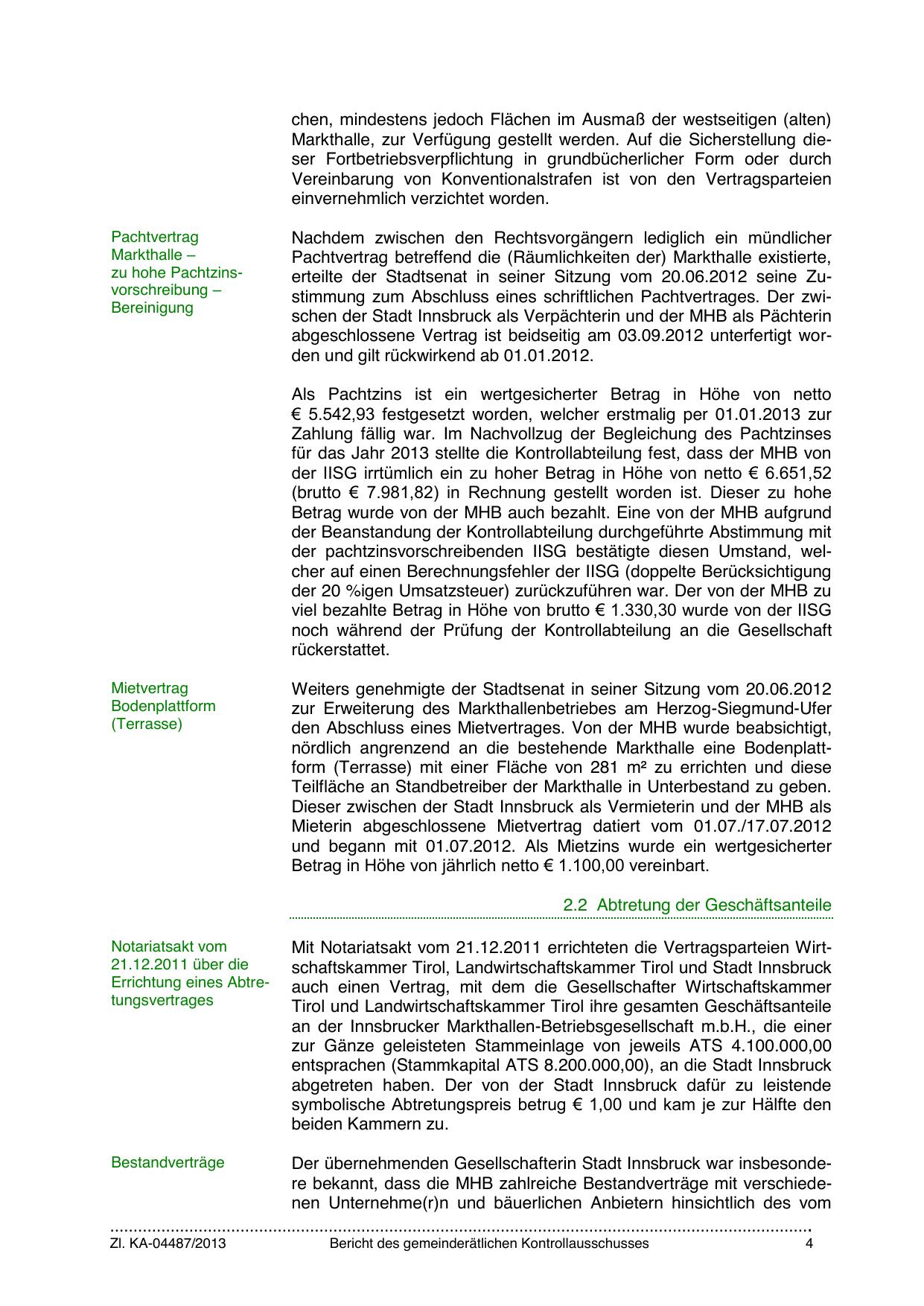 erteilte der Stadtsenat in seiner Sitzung vom 20.06.2012 seine Zustimmung zum Abschluss eines schriftlichen Pachtvertrages. Der zwischen der Stadt Innsbruck als Verpächterin und der MHB als Pächterin
