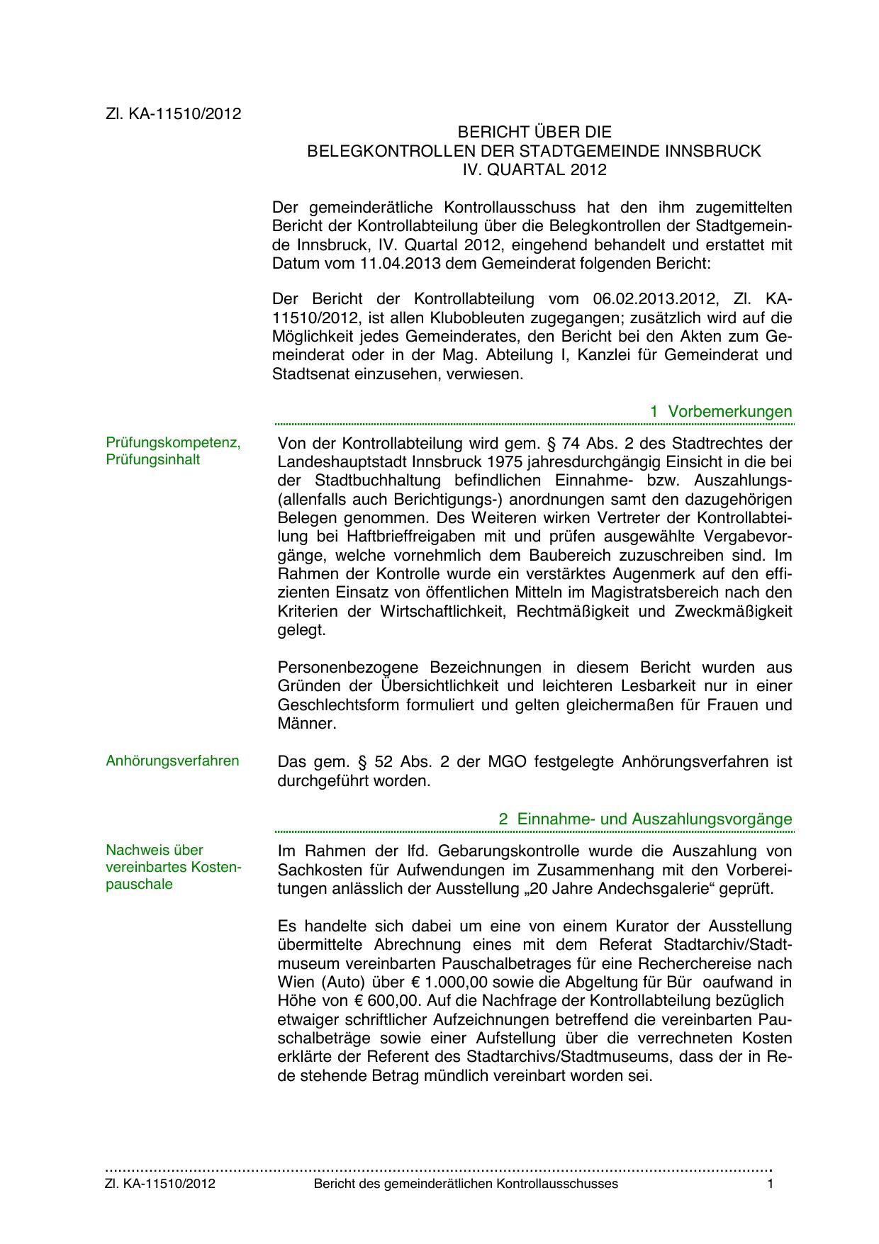 Bericht der Kontrollabteilung über die Belegkontrollen der Stadtgemeinde Innsbruck, IV. Quartal 2012, eingehend behandelt und erstattet mit
