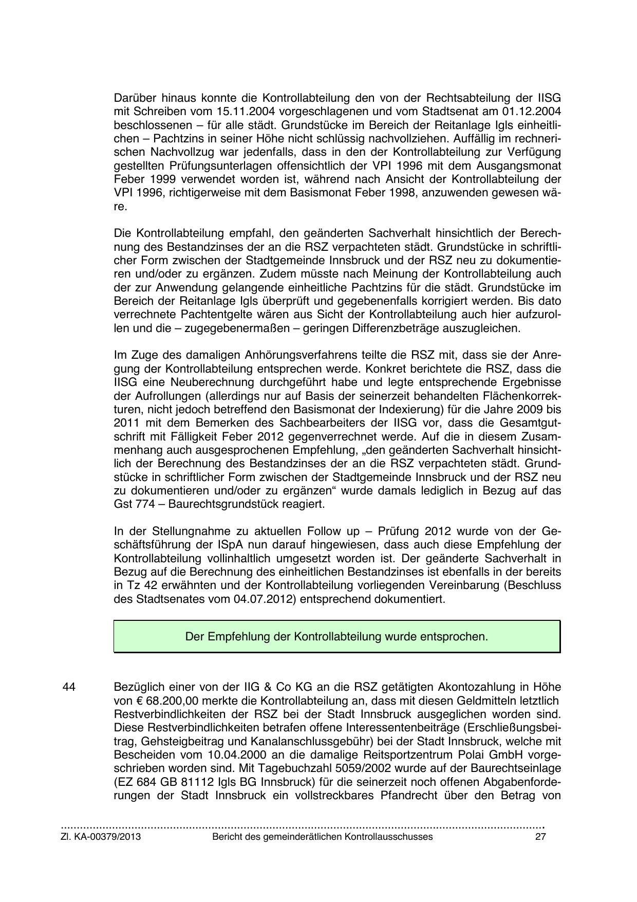 2011 mit dem Bemerken des Sachbearbeiters der IISG vor, dass die Gesamtgutschrift mit Fälligkeit Feber 2012 gegenverrechnet werde. Auf die in diesem Zusammenhang auch ausgesprochenen Empfehlung, „den geänderten Sachverhalt hinsichtlich der Berechnung des Bestandzinses der an die RSZ verpachteten städt. Grundstücke in schriftlicher Form zwischen der Stadtgemeinde Innsbruck und der RSZ neu