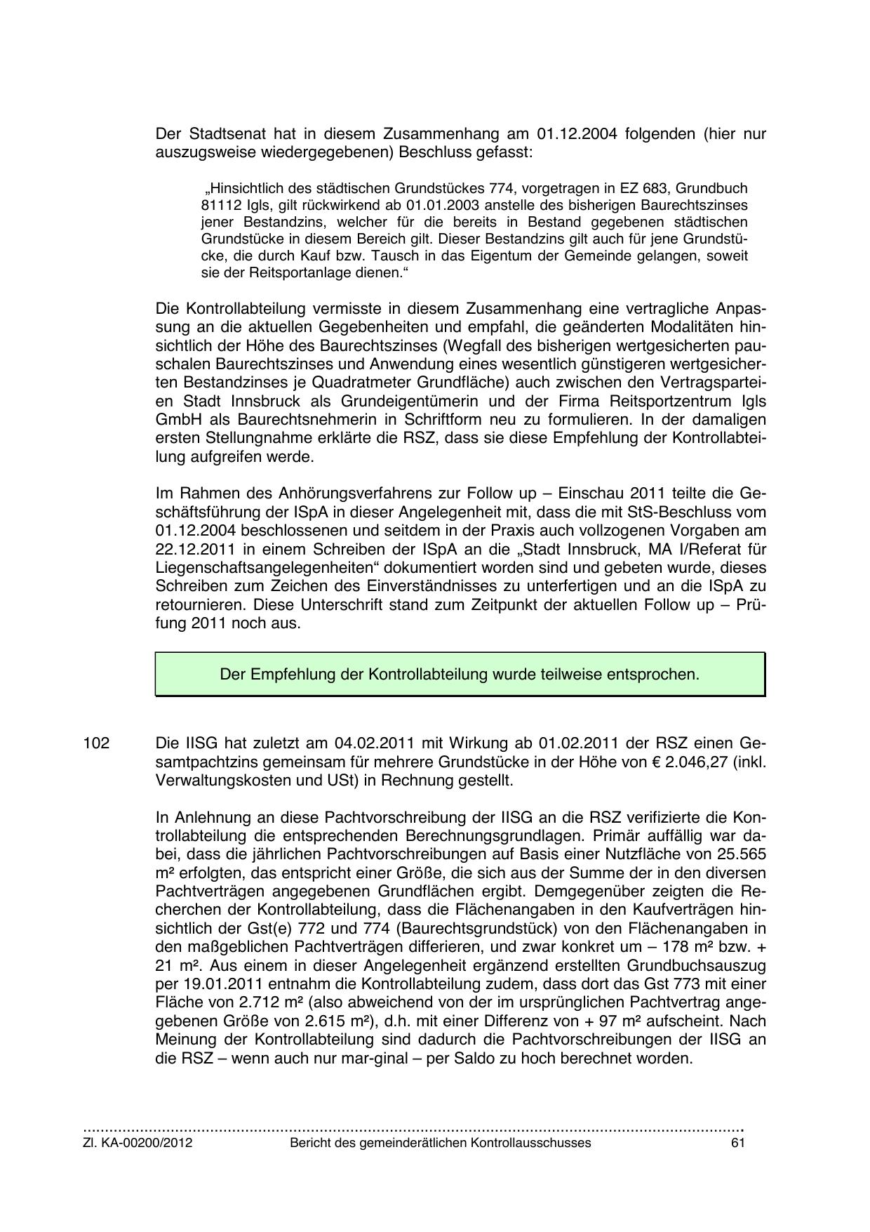 Die Kontrollabteilung vermisste in diesem Zusammenhang eine vertragliche Anpassung an die aktuellen Gegebenheiten und empfahl, die geänderten Modalitäten hinsichtlich der Höhe des Baurechtszinses (Wegfall des bisherigen wertgesicherten pauschalen Baurechtszinses und Anwendung eines wesentlich günstigeren wertgesicherten Bestandzinses je Quadratmeter Grundfläche) auch zwischen den Vertragsparteien Stadt Innsbruck als Grundeigentümerin und der Firma Reitsportzentrum Igls