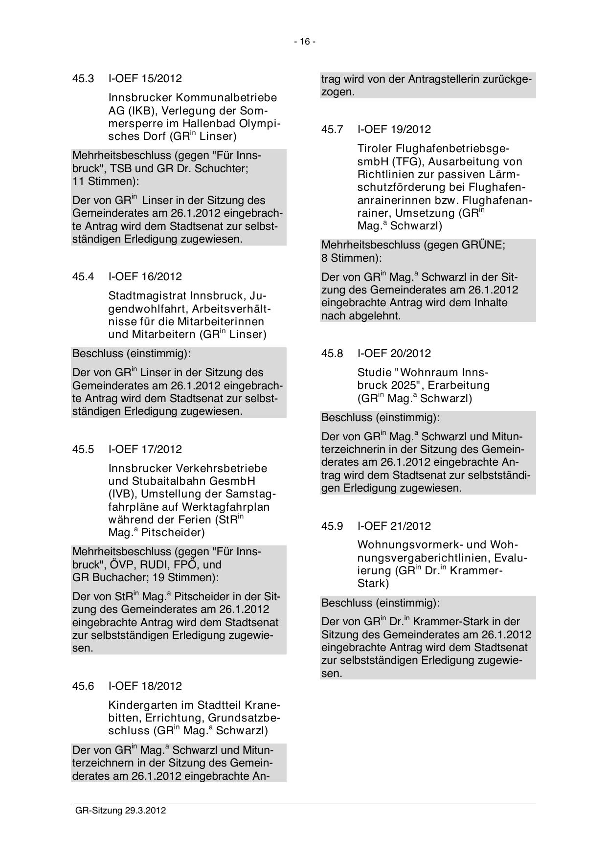 Mehrheitsbeschluss (gegen "Für Innsbruck", ÖVP, RUDI, FPÖ, und