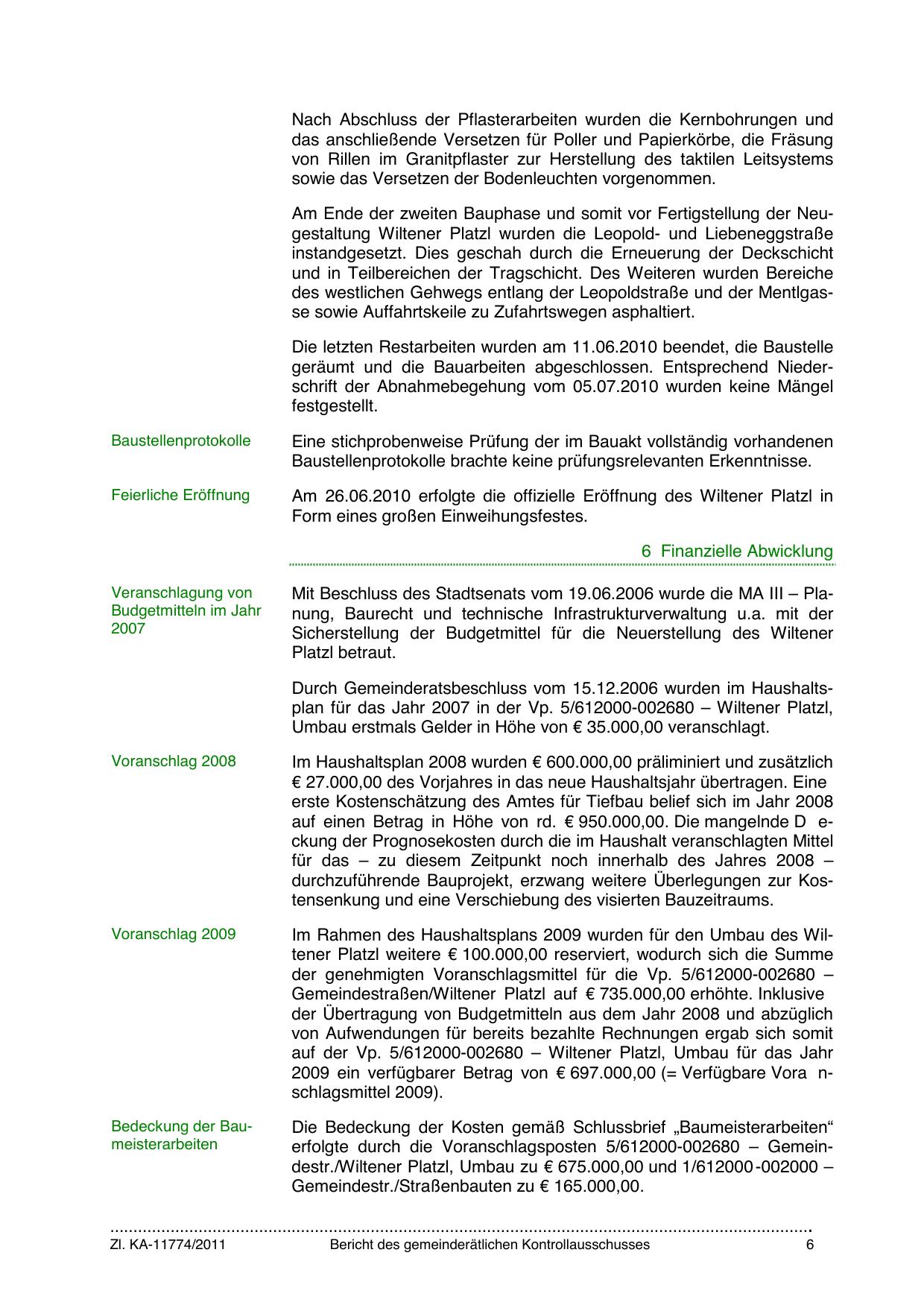 Durch Gemeinderatsbeschluss vom 15.12.2006 wurden im Haushaltsplan für das Jahr 2007 in der Vp. 5/612000-002680 – Wiltener Platzl,