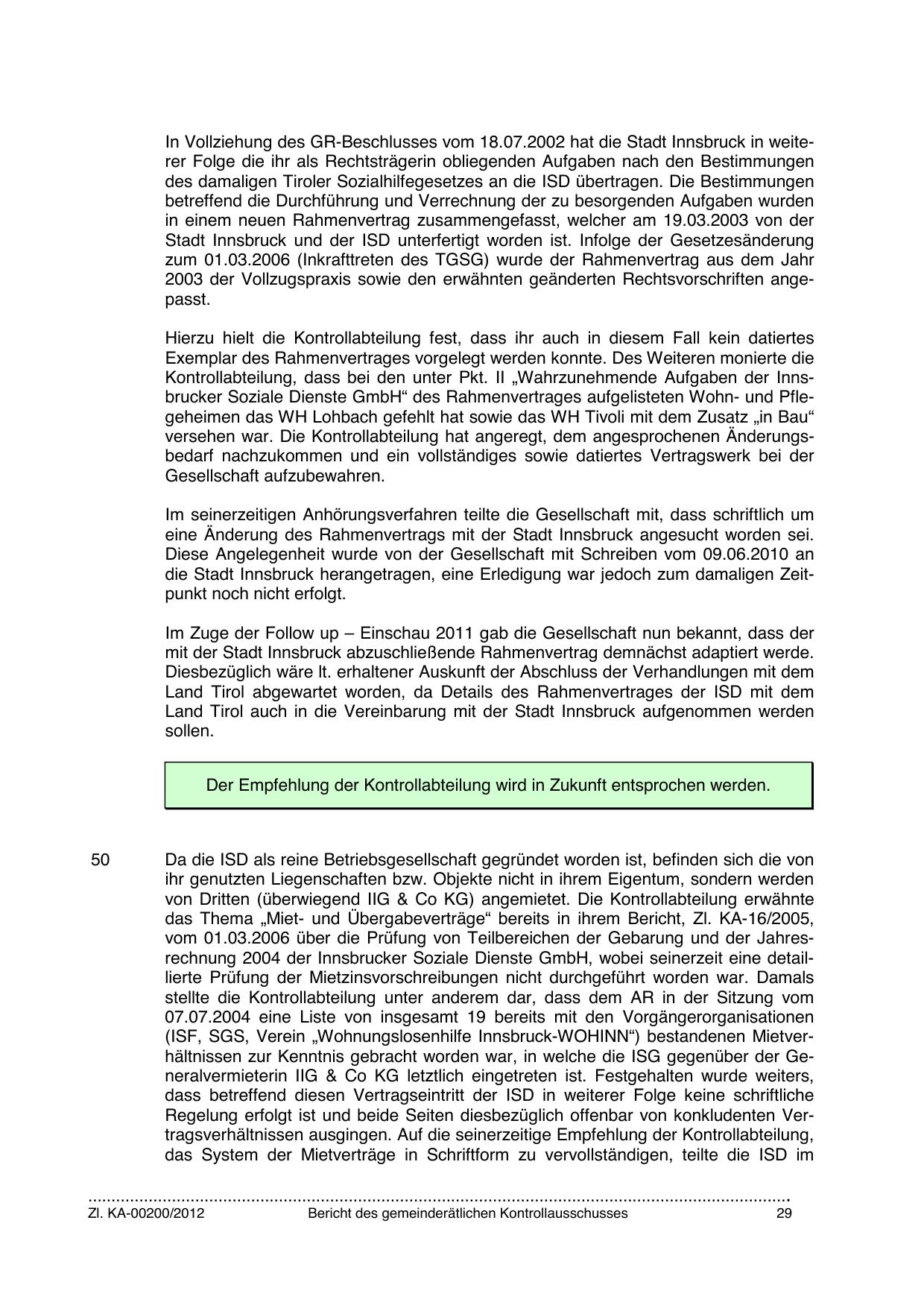 vom 01.03.2006 über die Prüfung von Teilbereichen der Gebarung und der Jahresrechnung 2004 der Innsbrucker Soziale Dienste GmbH, wobei seinerzeit eine detaillierte Prüfung der Mietzinsvorschreibungen nicht durchgeführt worden war. Damals