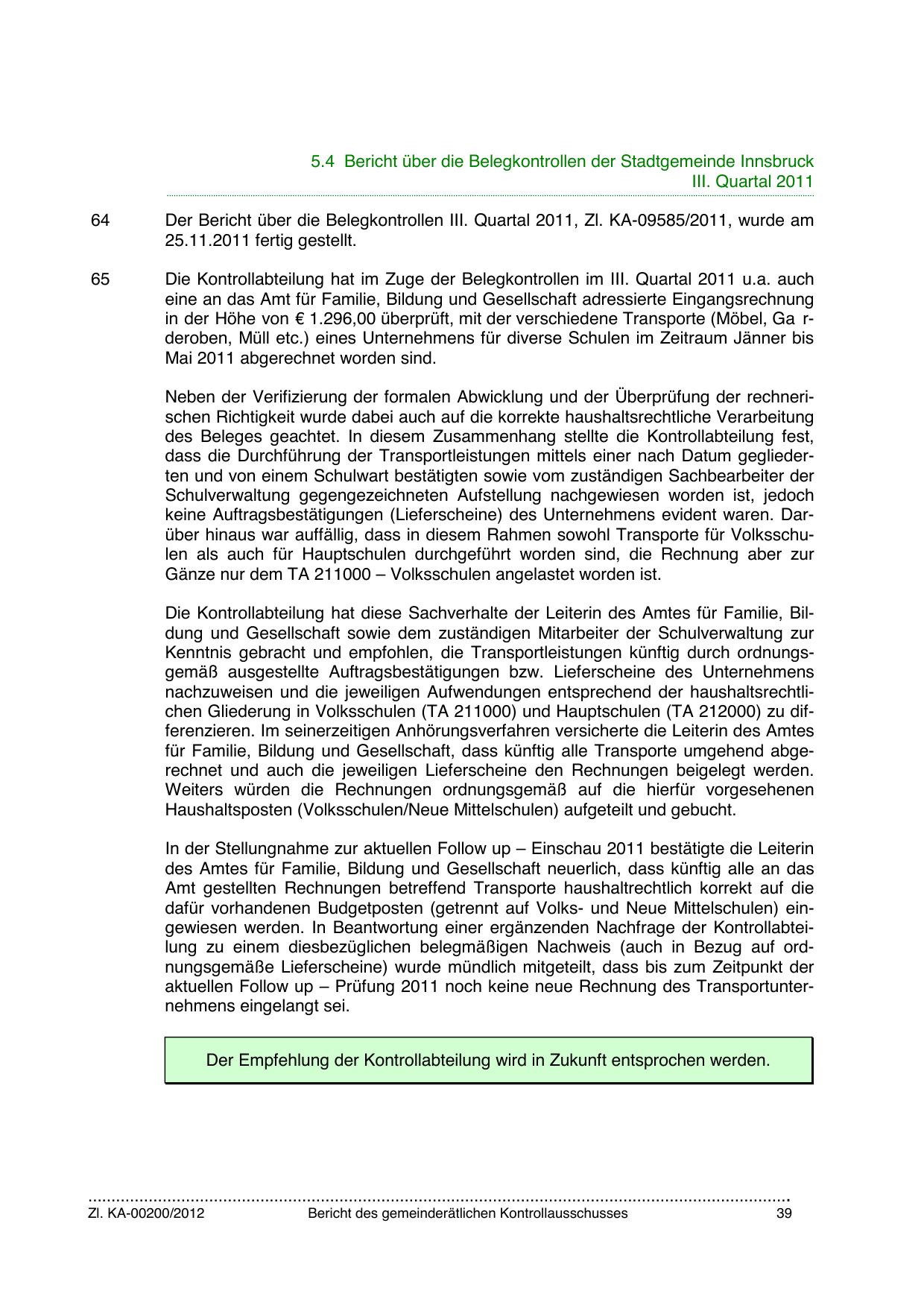 5.4 Bericht über die Belegkontrollen der Stadtgemeinde Innsbruck