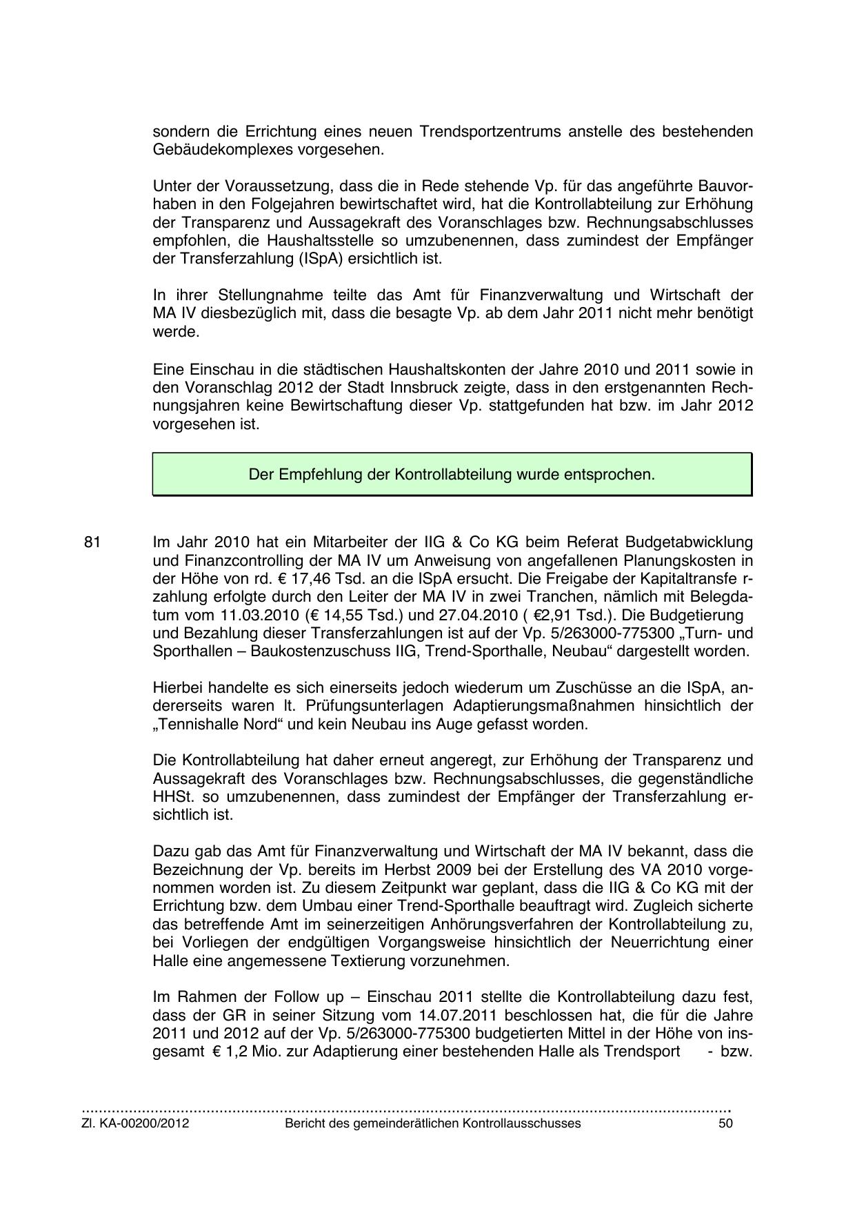 den Voranschlag 2012 der Stadt Innsbruck zeigte, dass in den erstgenannten Rechnungsjahren keine Bewirtschaftung dieser Vp. stattgefunden hat bzw. im Jahr 2012